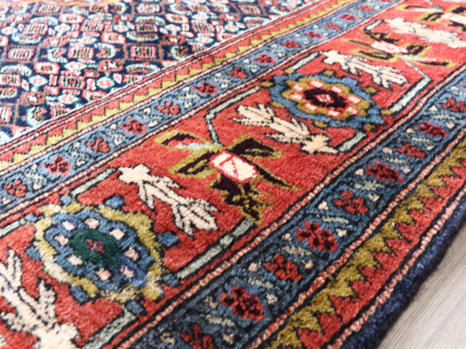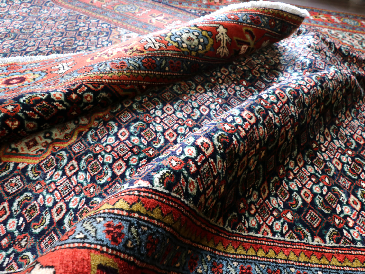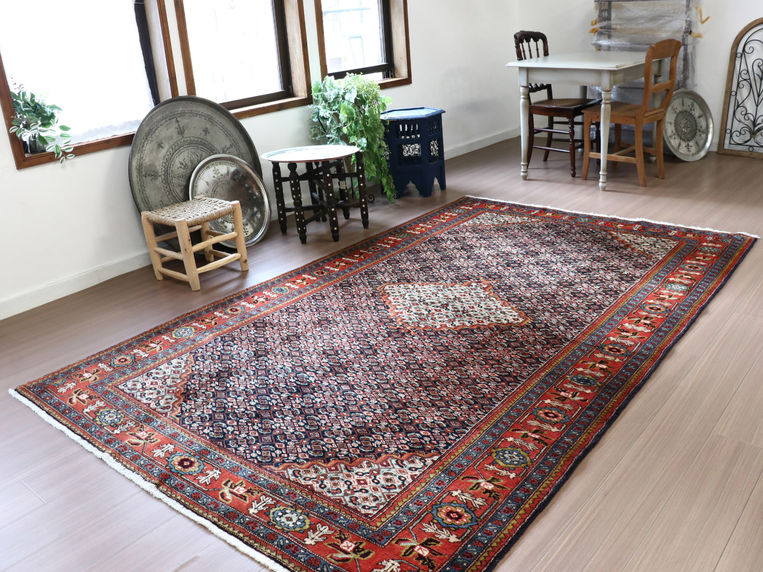 イラン北西部、カスピ海沿岸のアルダビルエリアで織られた大型の絨毯です。細長い長方形サイズや、朱赤に大振りの花が織り込まれたボーダーは、コーカサス地方の伝統的なデザインにも似ていて、中央の細かな連続模様との対比がとてもユニークです。白っぽく見える中央のメダリオンとコーナーは、明るい水色が使われています。