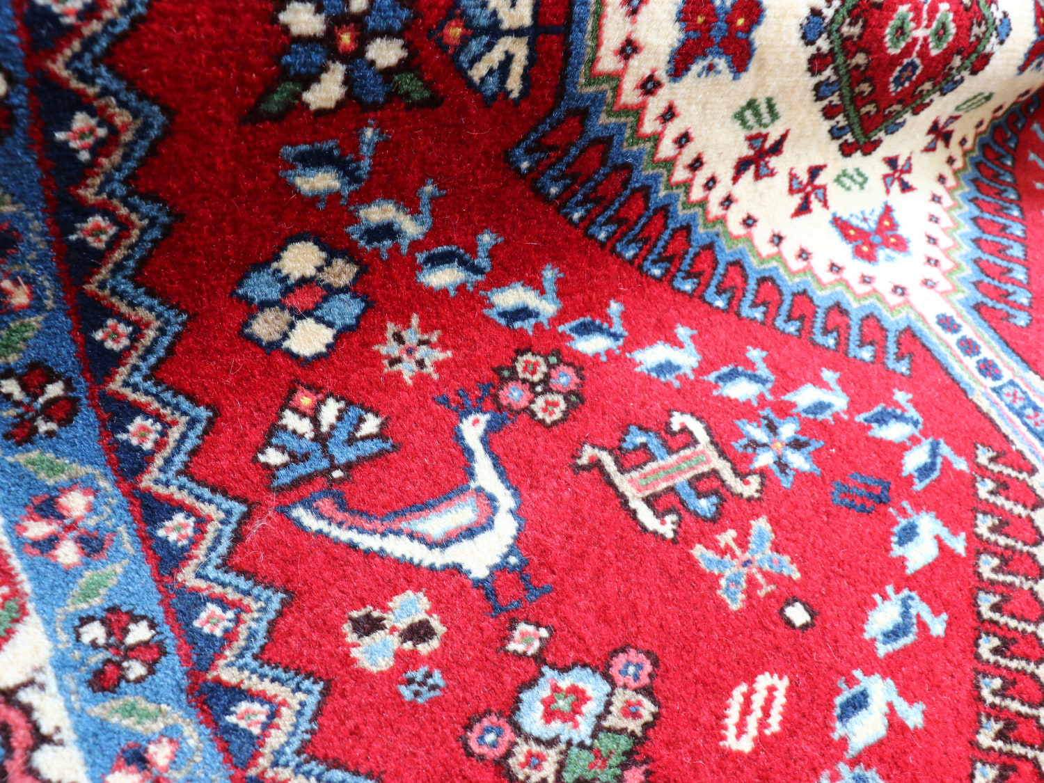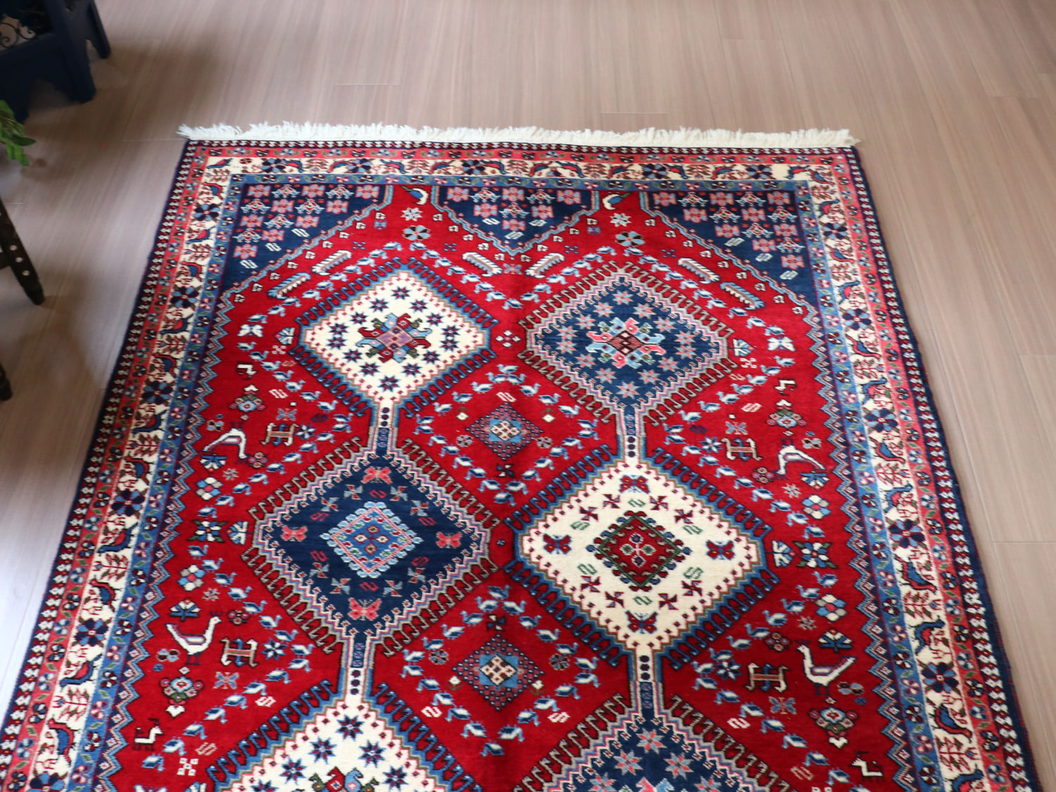 - トライバルラグ 部族絨毯 イラン南部ヤラメ Yalameh 200×148cm レッド 6つのひし形メダリオン 鳥モチーフ