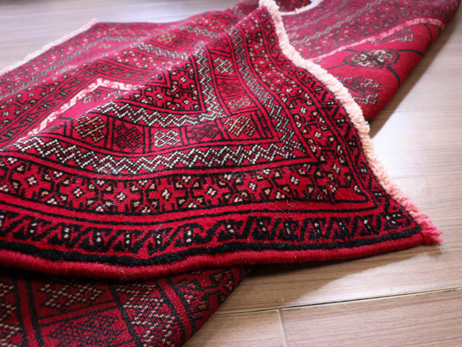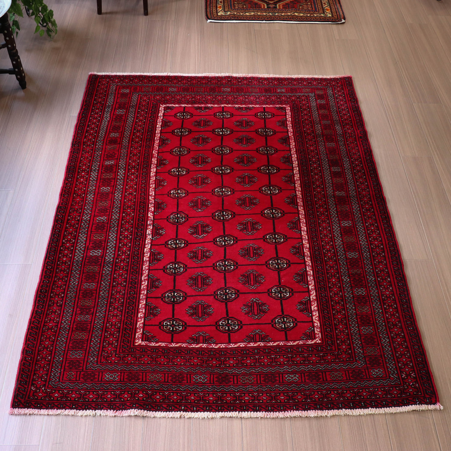 中央アジアからアフガン・パキスタンなどに住むトルクメン族のカーペット。ギュルと呼ばれる文様が連なる伝統的なデザインです。横幅が広い長方形で、使いやすい一枚。赤の色はずっしりと重たい感じではなく、わずかにピンクがかった明るめの色です。