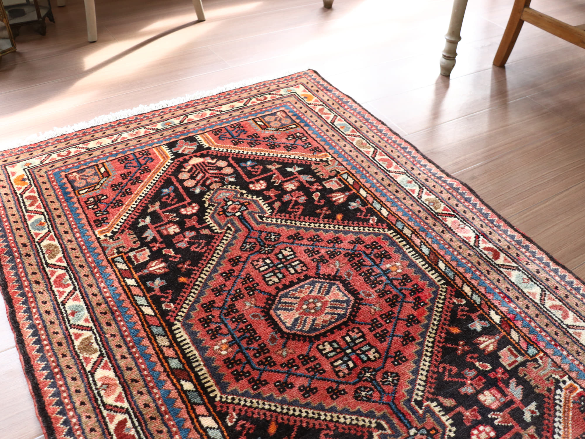 均整の取れたメダリオン柄のヴィンテージラグです。イラン西部ハマダン地方の山岳エリア、トイセルカンという町で織られています。ほどよく色褪せて、シックなイメージの一枚。