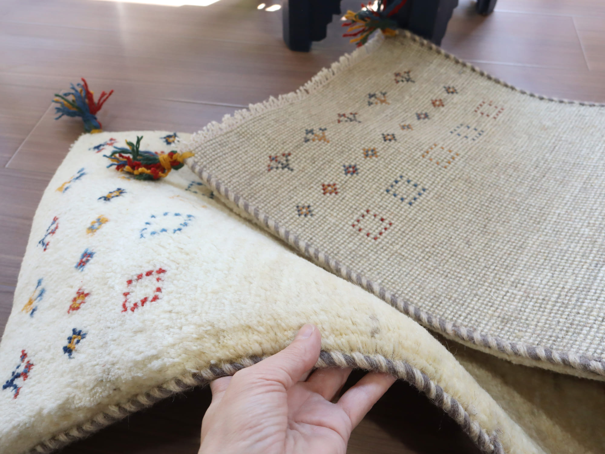 毛足が長く、パイルを含めたギャッベ全体の厚みは2.2-2.3cm程度。ボリューム感たっぷりのふかふかギャッベです。