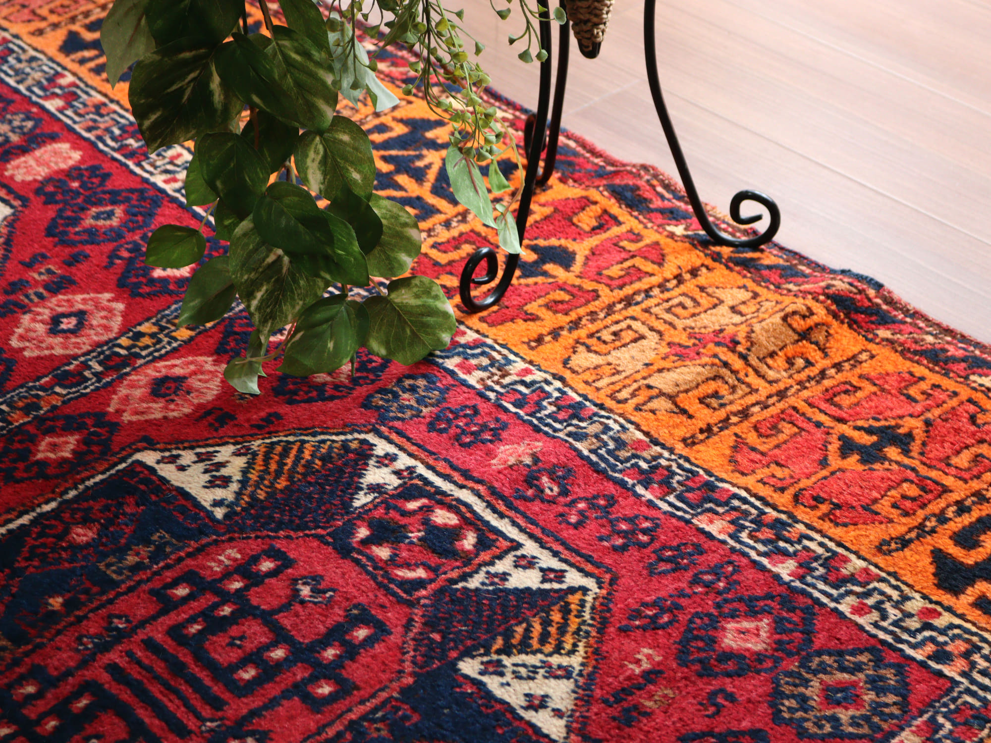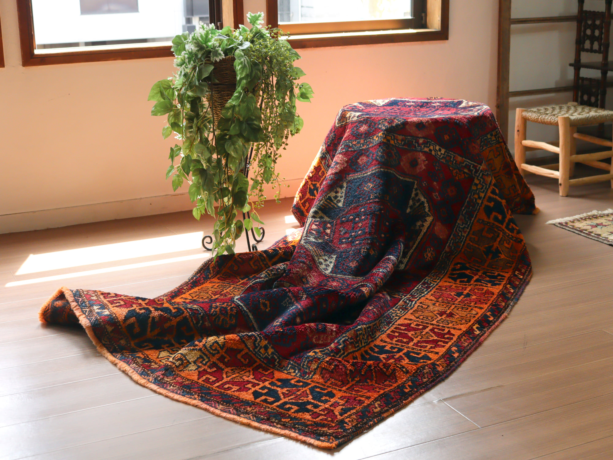 発色の良いレッド、ネイビー、オレンジのコントラストが力強くインパクトのある1枚。トルコ南東部に移り住んだクルド族の手による織りと推測できます。