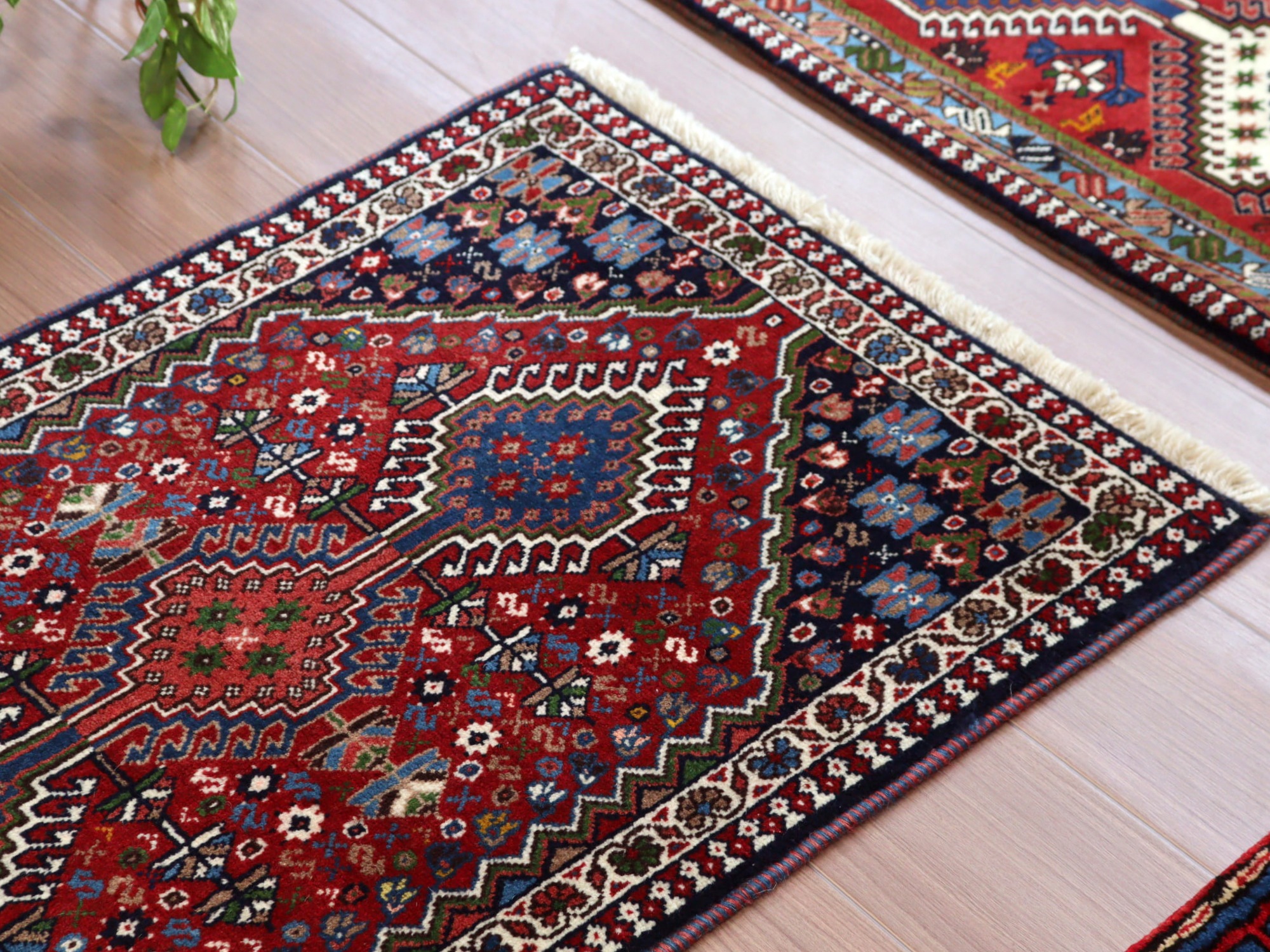パイルは短めで、ベースを含めたラグ全体の厚みは1cm弱。ギュっと目のつまった細かな織り目の絨毯です。