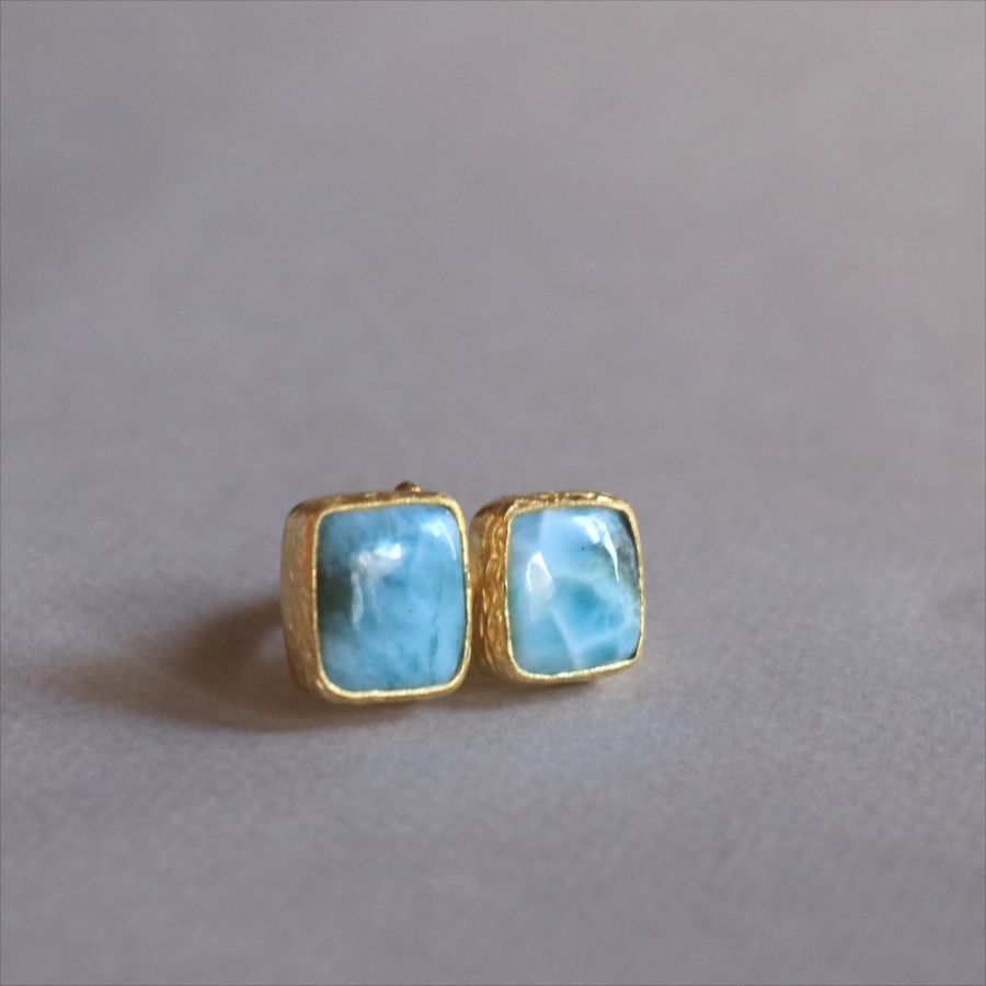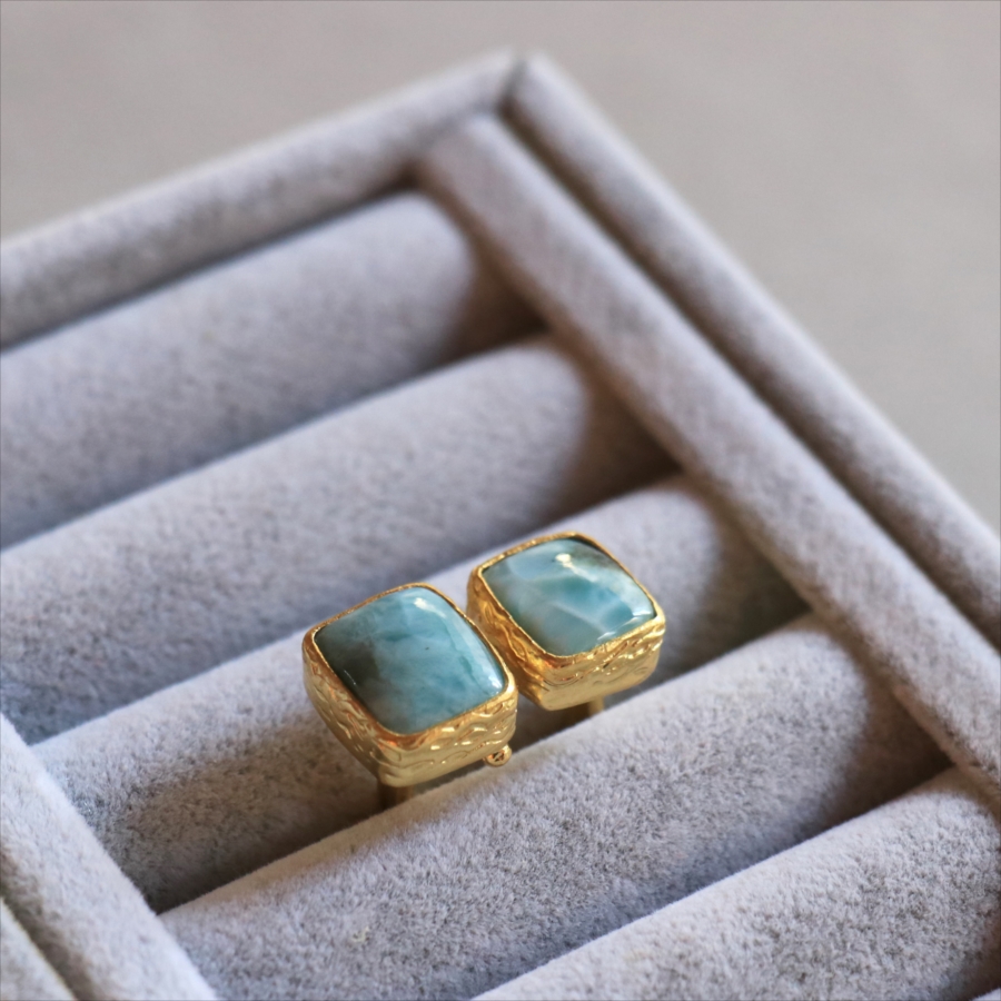 海に映る雲のような模様が広がる、優しいブルーが美しいラリマーダブルリングです。スクエア形のふたつの石が寄り添うように並ぶデザイン。シンプルながらも個性的が光る一点ものジュエリーです。
