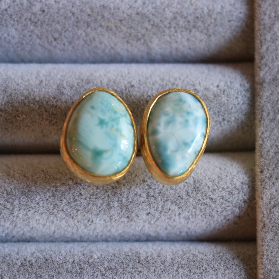 海に映る雲のような模様が広がる、優しいブルーが美しいラリマーダブルリングです。形の違うふたつの石が寄り添うように並ぶデザイン。大粒で立体感があり、シンプルながらも個性的が光る一点ものジュエリーです。