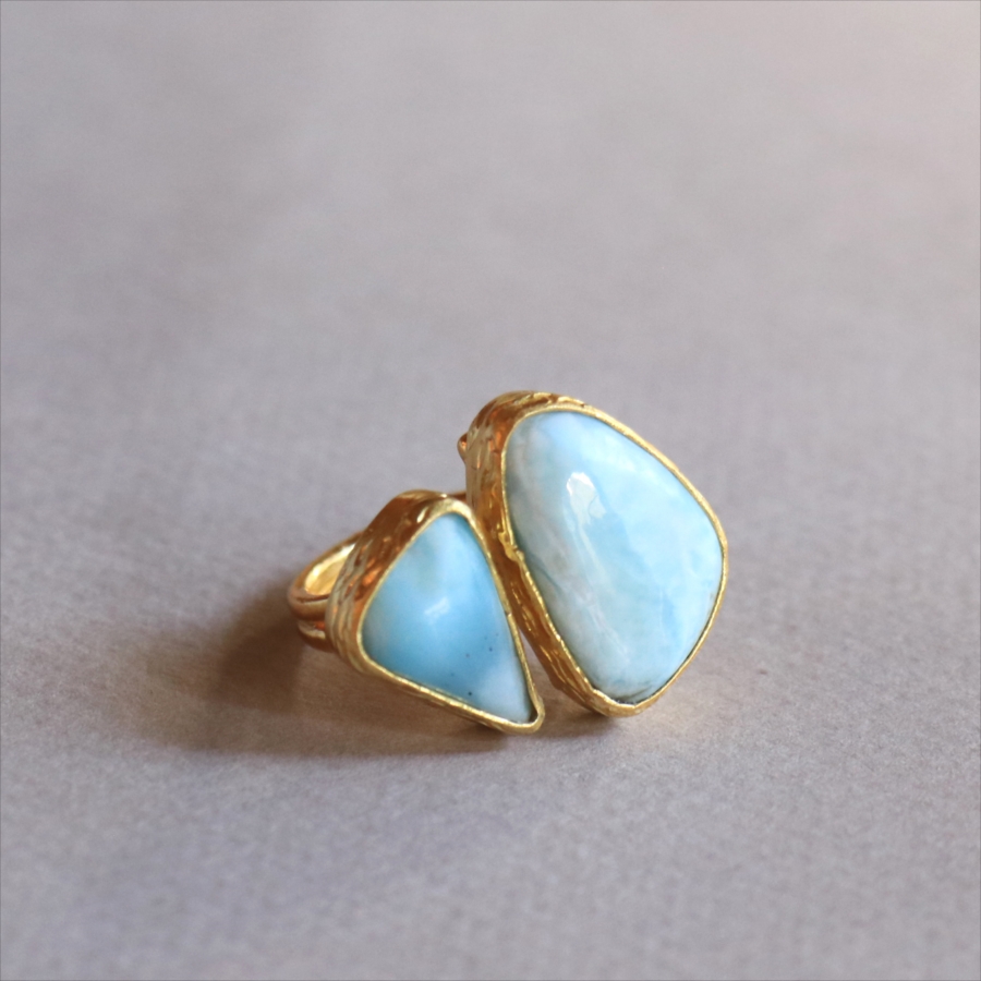 海に映る雲のような模様が広がる、優しいブルーが美しいラリマーダブルリングです。、大粒のラリマーに寄り添うような小さなラリマー。その絶妙なバランスは、シンプルでいて印象的に手元を美しくみせてくれます。