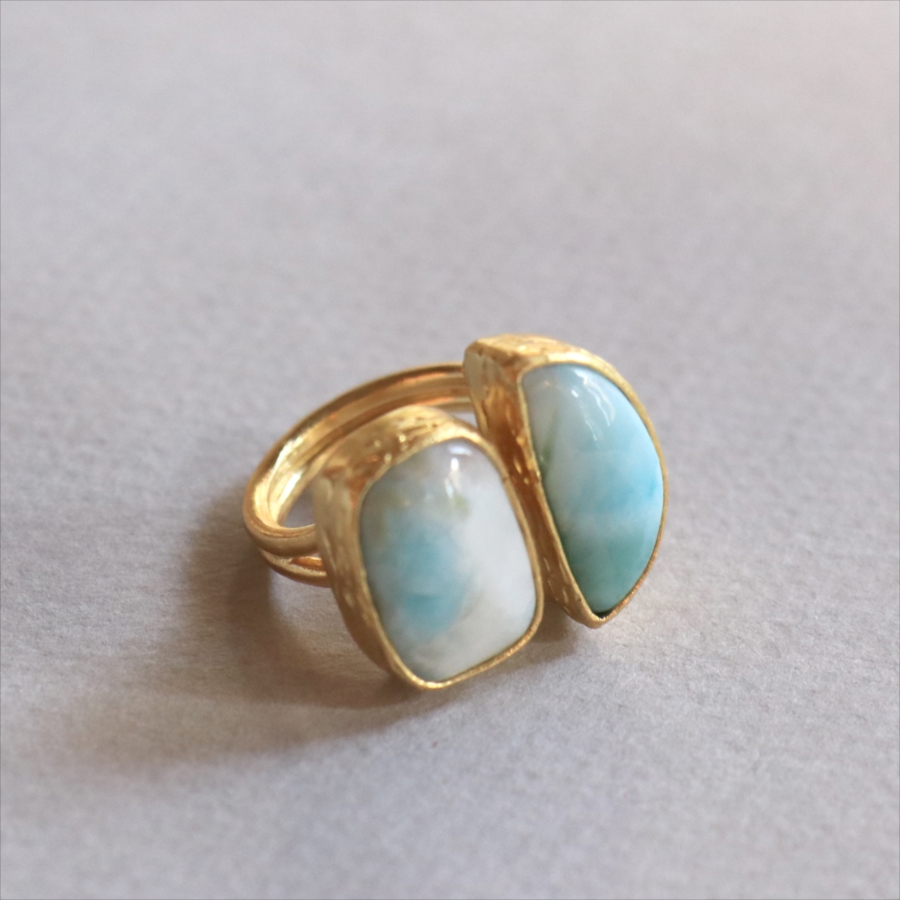 海に映る雲のような模様が広がる、優しいブルーが美しいラリマーダブルリングです。、半月形と丸みのあるスクエア形の2粒のラリマー。その絶妙なバランスは、シンプルでいて印象的に手元を美しくみせてくれます。