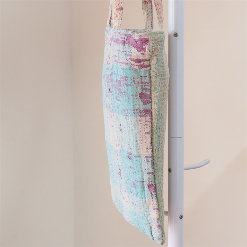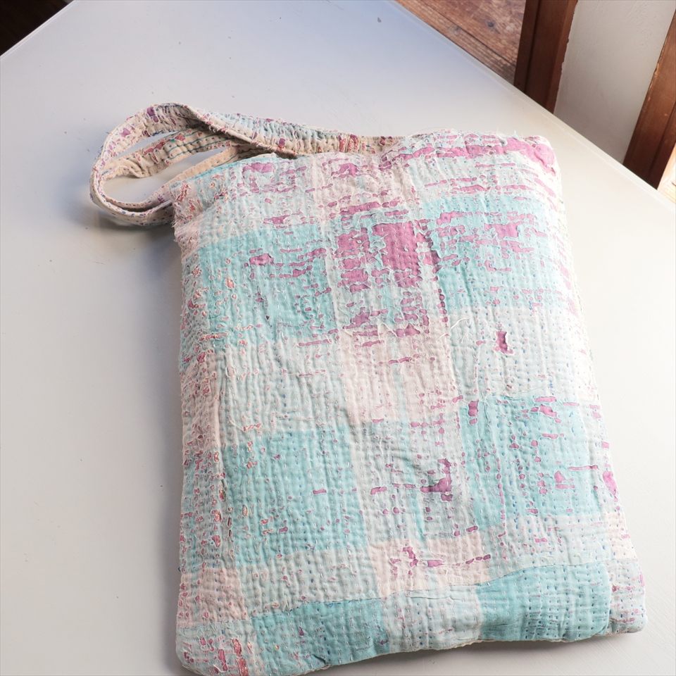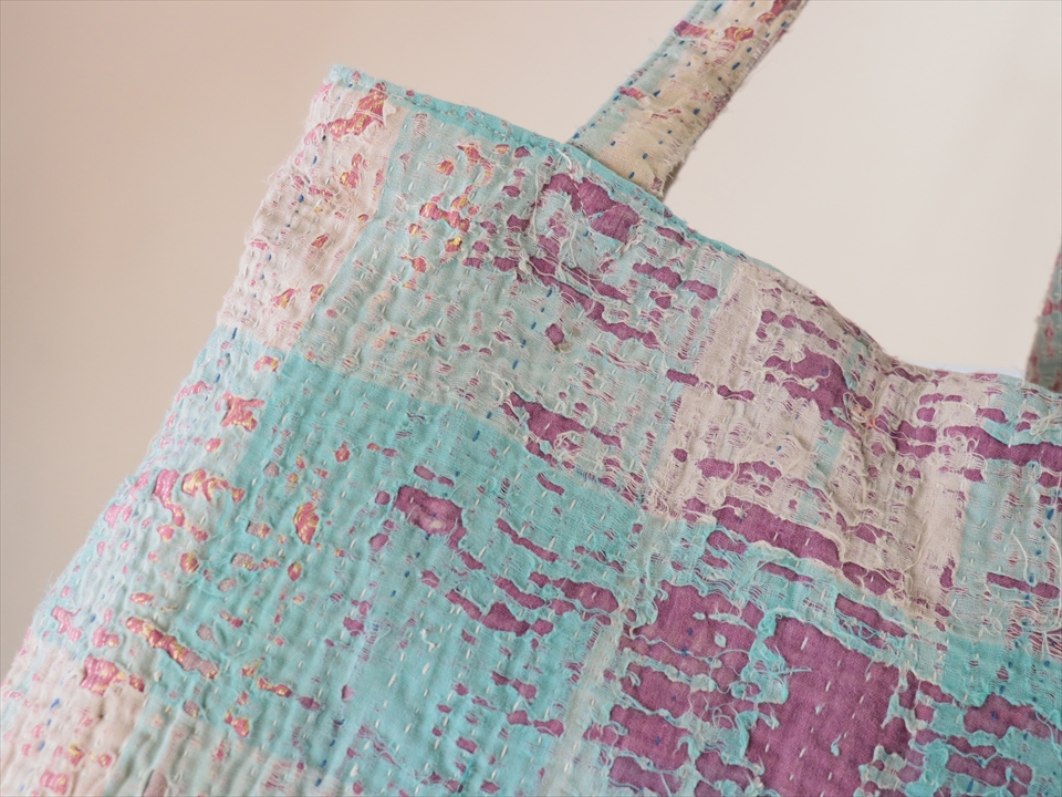 使い古された民族衣装のサリーやドゥパタを重ねて、刺し子刺繍をした伝統的な手仕事の布を使っています。表面のコットンは擦り切れているところもあるほど使い込まれていて、ヴィンテージ感たっぷり。コットンのやわらかな肌触りが心地よく、普段使いのバッグとして活躍してくれそうです。