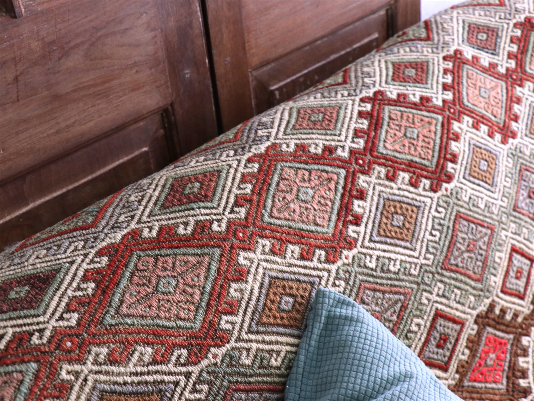 ジジムでドラゴンのモチーフが連なるように全面に織り込まれています。ブラウンベースに、差し色で入ったレッドがアクセントになっています。