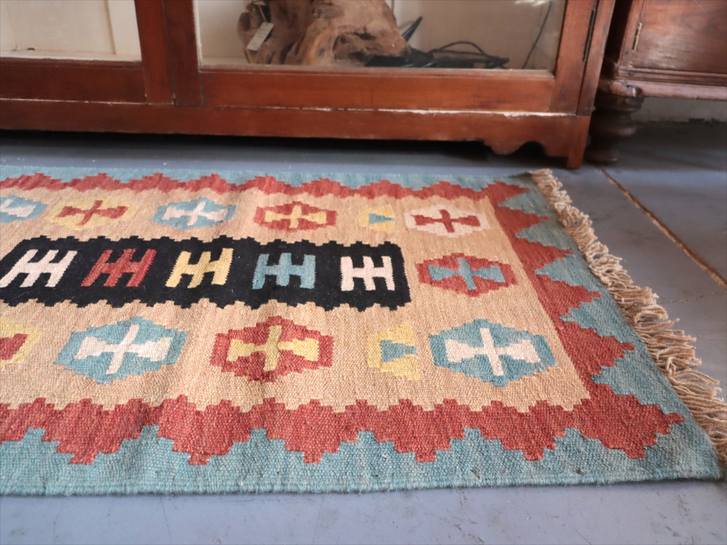 6-7mm程度の厚みがあり、パイル(毛足)がない平織りの敷物で表面は少しザラっとした肌ざわりです。織り手の自由なアイデアでデザインされていますので、左右対象でなかったり、モチーフが少しずれていたりということもありますが、世界で一枚だけの作品ですからその点はご了承ください。