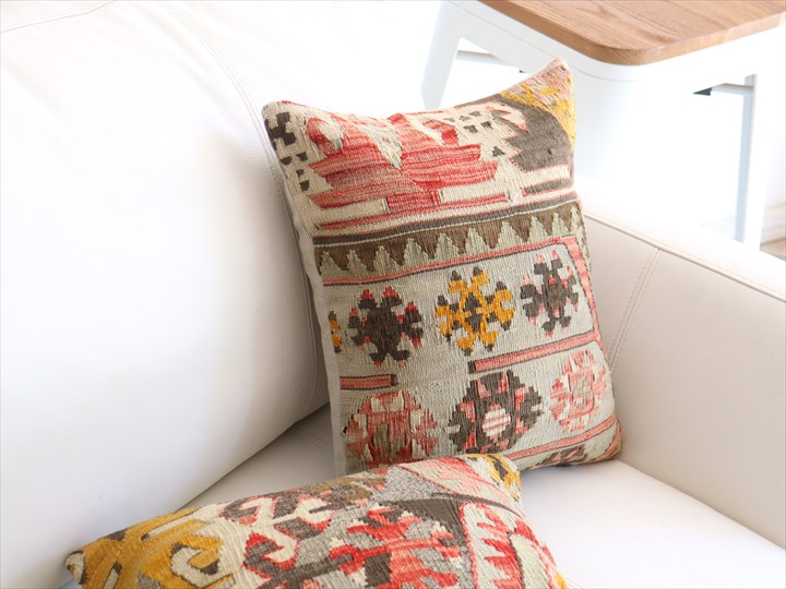 Key:Old Kilim, Kilim Cushion, Turkish Kilim, BOHO, Bohemian Decor, Vintage kilim, クッションカバー, オールドキリム, トルコ, ヴィンテージキリム, トライバルラグ, ピロー, ボヘミアンスタイル, BO-HO, ウール100%, 手織り, 一点もの, ガラタバザール