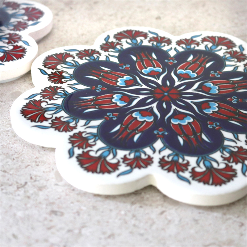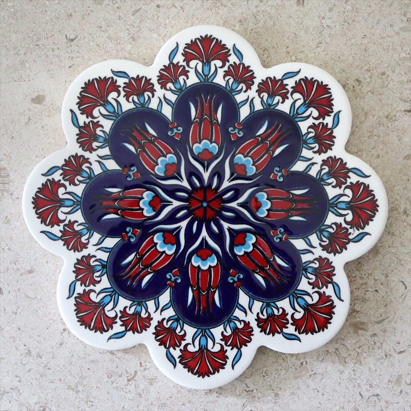 トルコの伝統的なイズニック(IZNIK)セラミックアートを再現した鍋敷きです。チューリップなどの花模様を中心に、色鮮やかな陶器に仕上がっています。コースターやインテリアとしても楽しめるアイテムです。トルコを代表する花、チューリップとカーネーションをモチーフにした伝統的な美しさのあるデザイン。