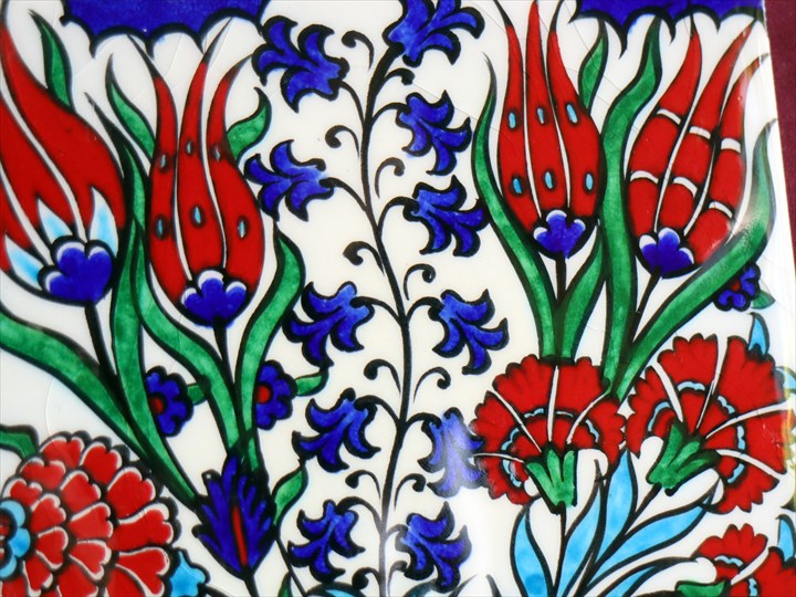 トルコを代表する花であるチューリップ&カーネーションを色鮮やかに描いた絵柄は、近年トルコで浸透し始めているモダンデザイン。独特のトルコスタイルが凝縮された繊細なデザインは、現地の職人によって1枚ずつ手描きされたものです。