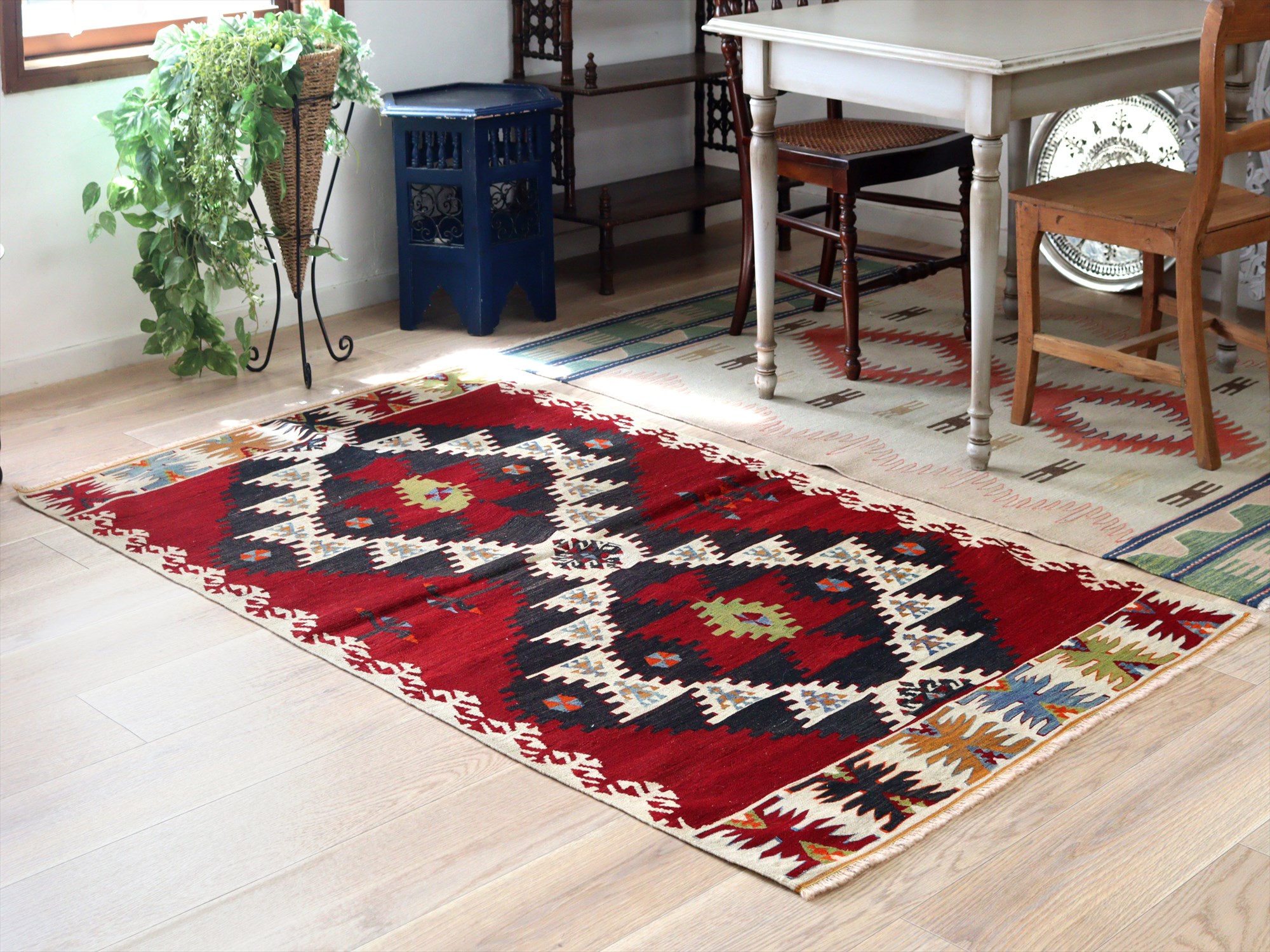 トルコのカイセリ地方に位置する小さな村、ヤイヤルから出たキリムです。発色の良い赤のグラデーションベースに、小さいモチーフの組み合わせでメダリオンが構成されています。