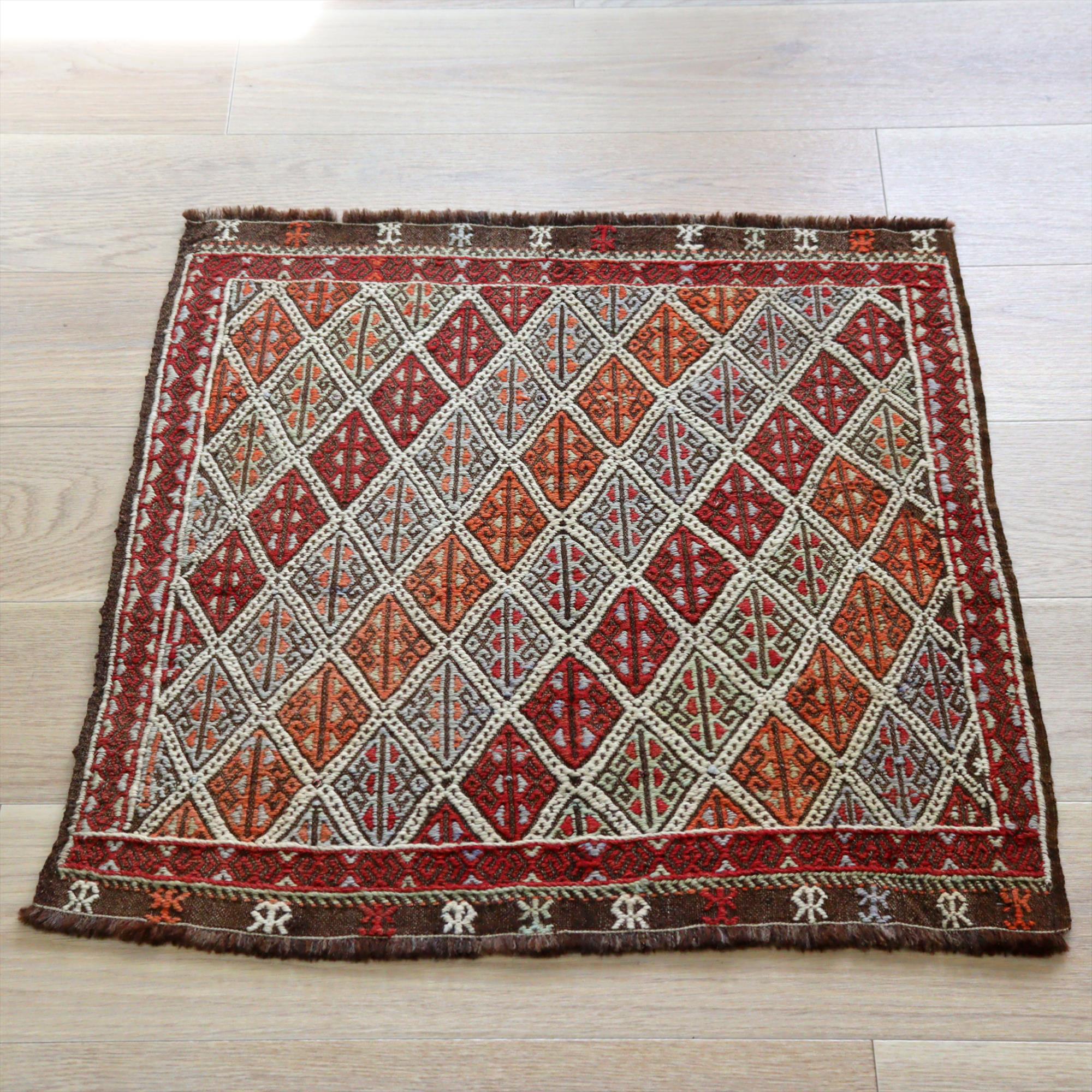 一面がジジム織りのキリム。連なるように織られたダイヤの中には、手足を伸ばすドラゴンのモチーフが表現されています。スクエアサイズで大きすぎず、アクセント使いにも丁度良いサイズです。