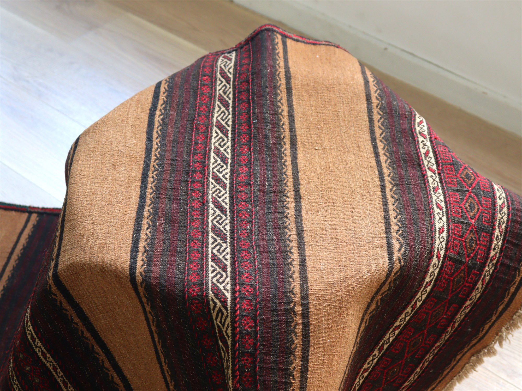 平織りとスザンニ織りのミックスで織られたバルーチ族のキリムです。刺繍のように織られている部分は、スザンニ織りが成されていて、緻密で丁寧に幾何学模様が織られています。