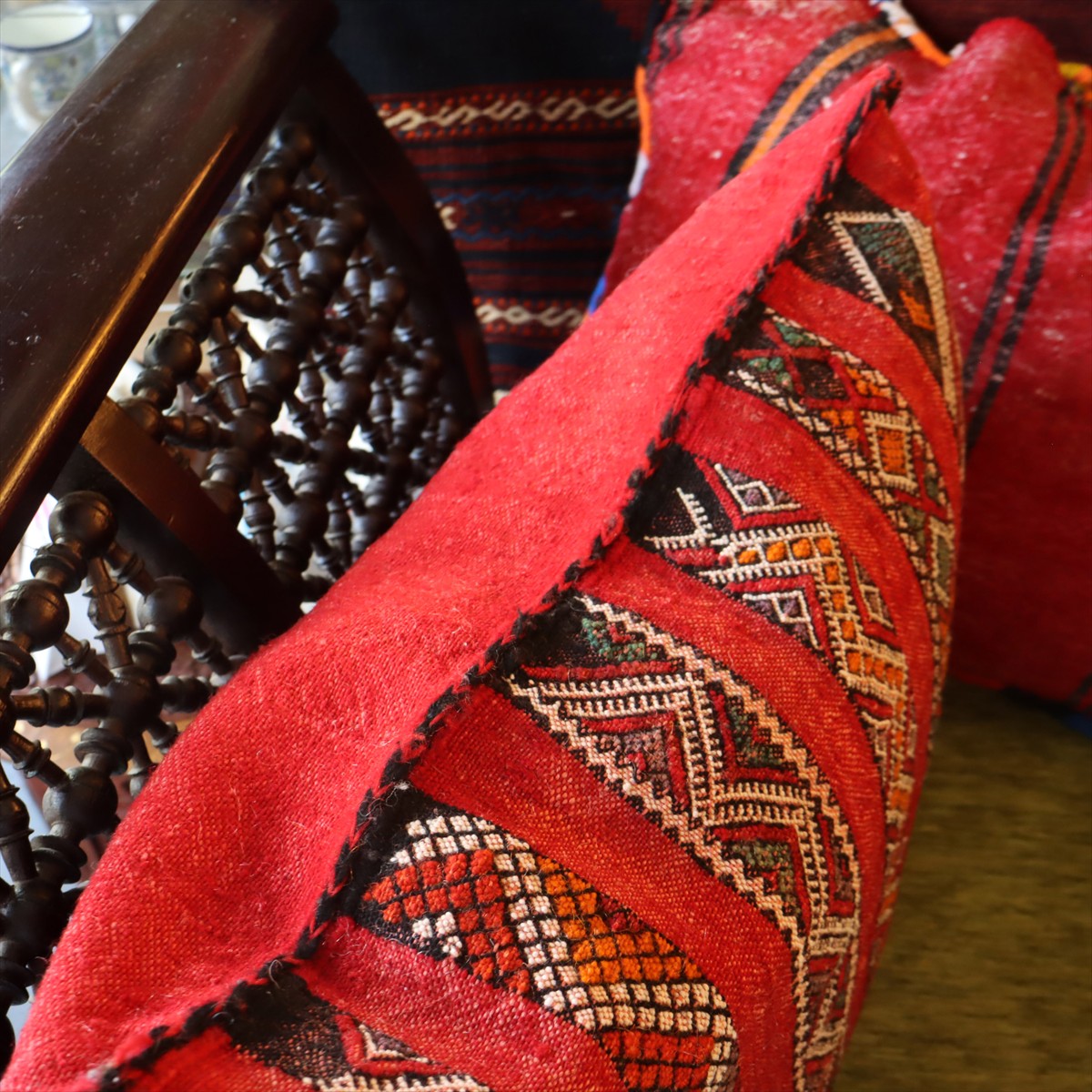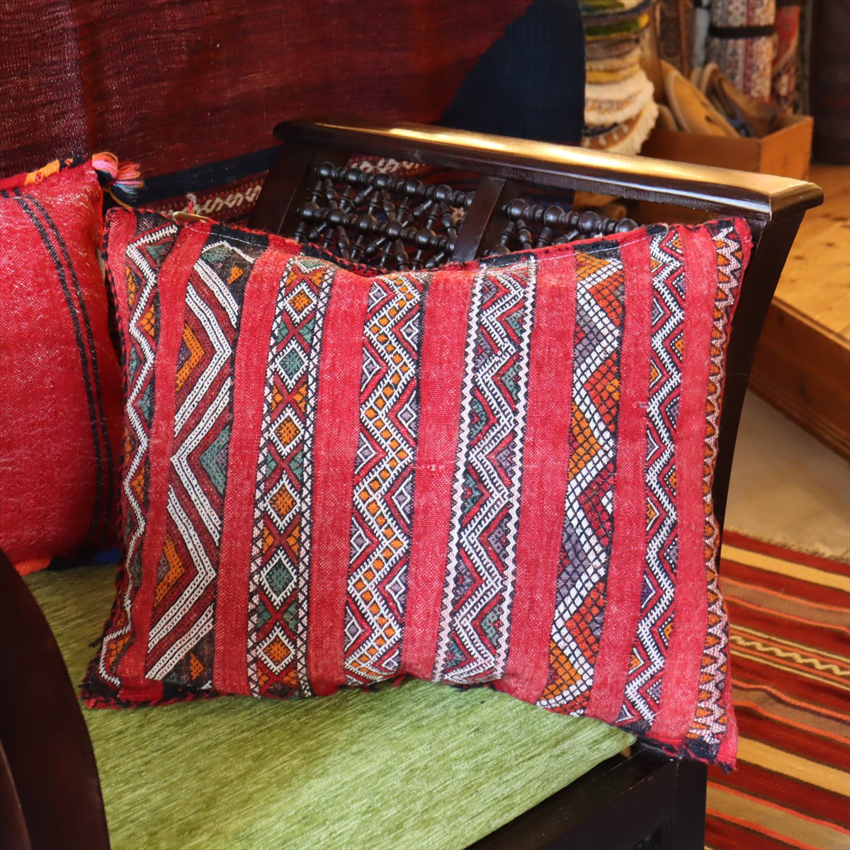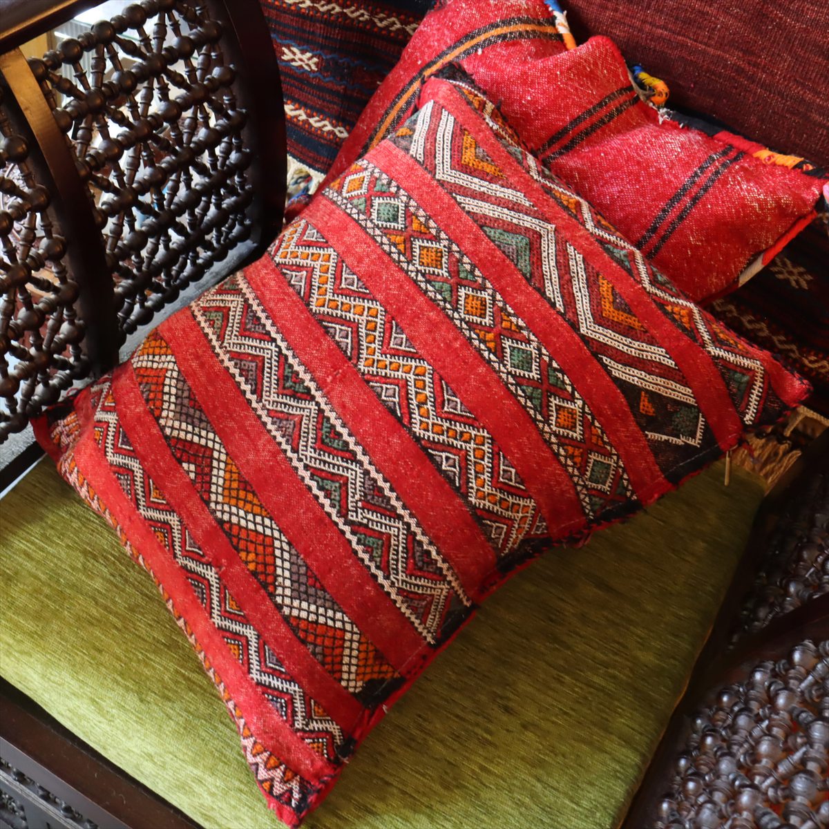 - オールドキリムクッション モロッコ オリジナル47×40cm OUTLET ホツレあり ゼモール レッド ジジム織り