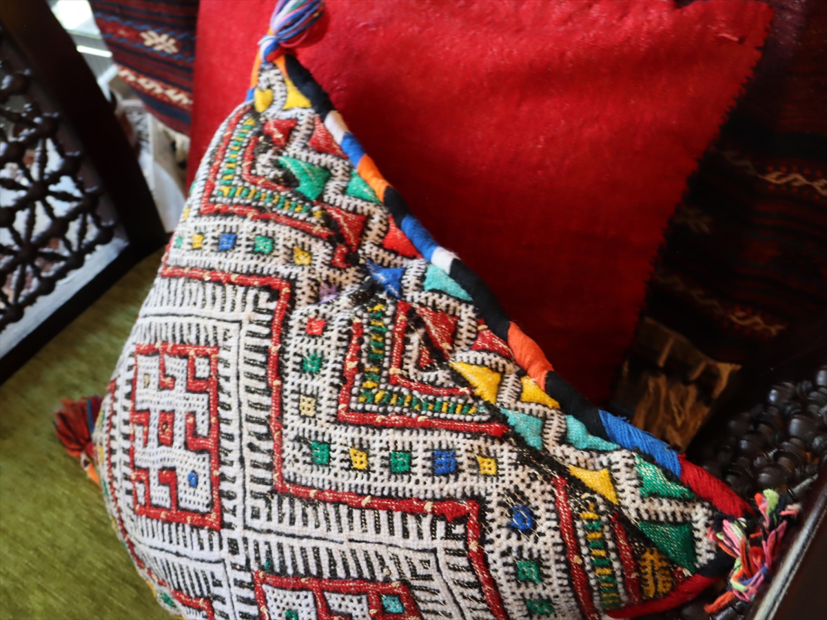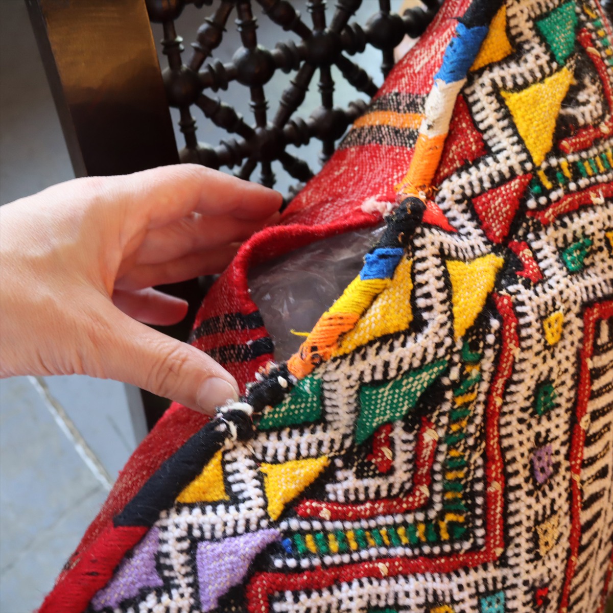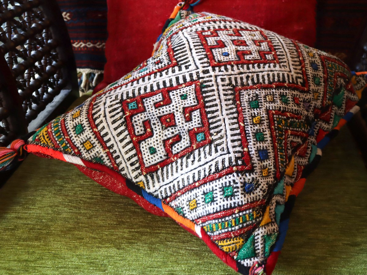 もともとクッションとして使うために織られたもので、四隅にはポンポンもつけられています。表面は刺繍のようにも見えますが、ベルベル族の伝統的な技法の織りです。(スマック織りのグループ)