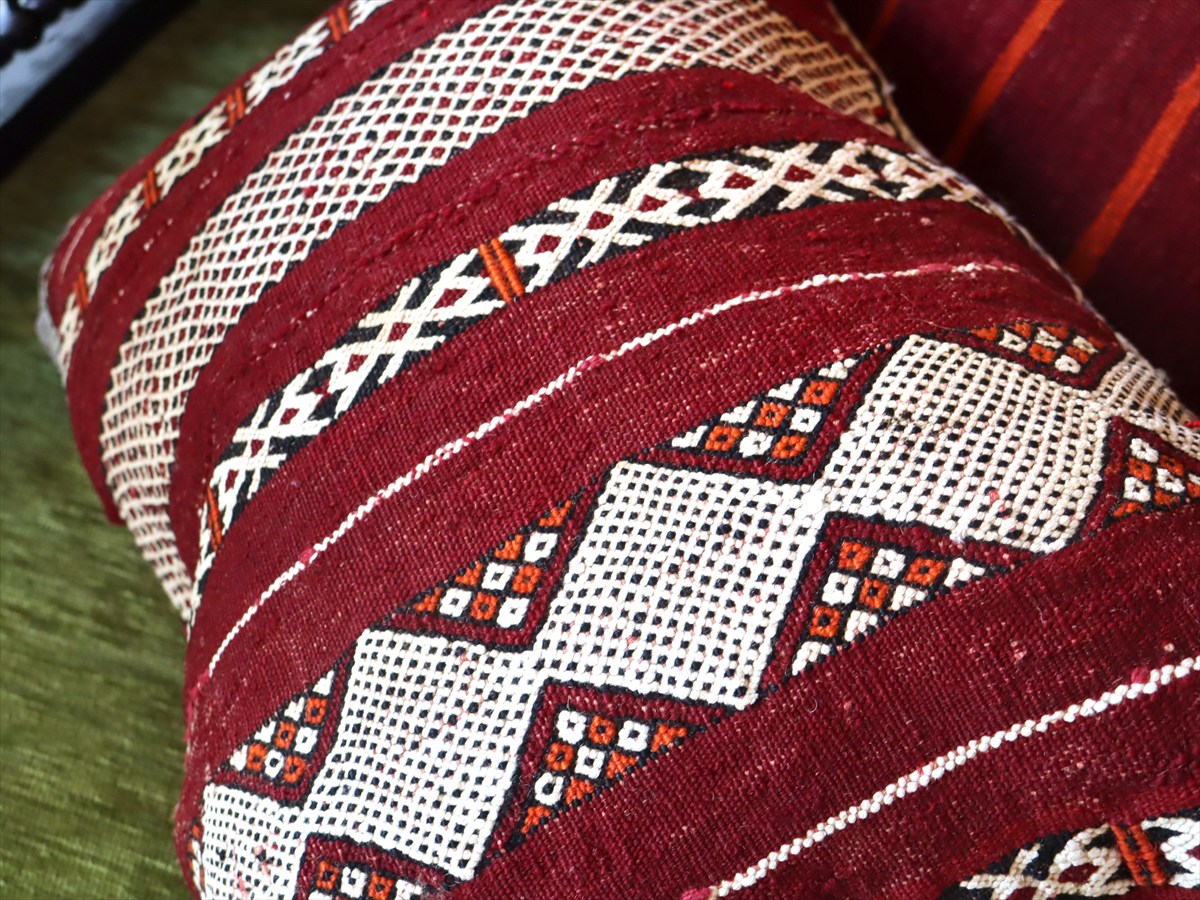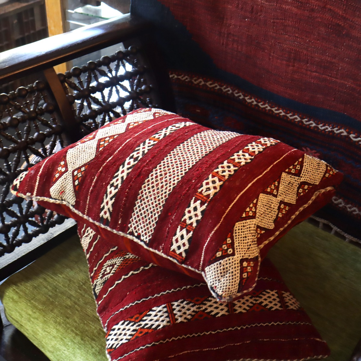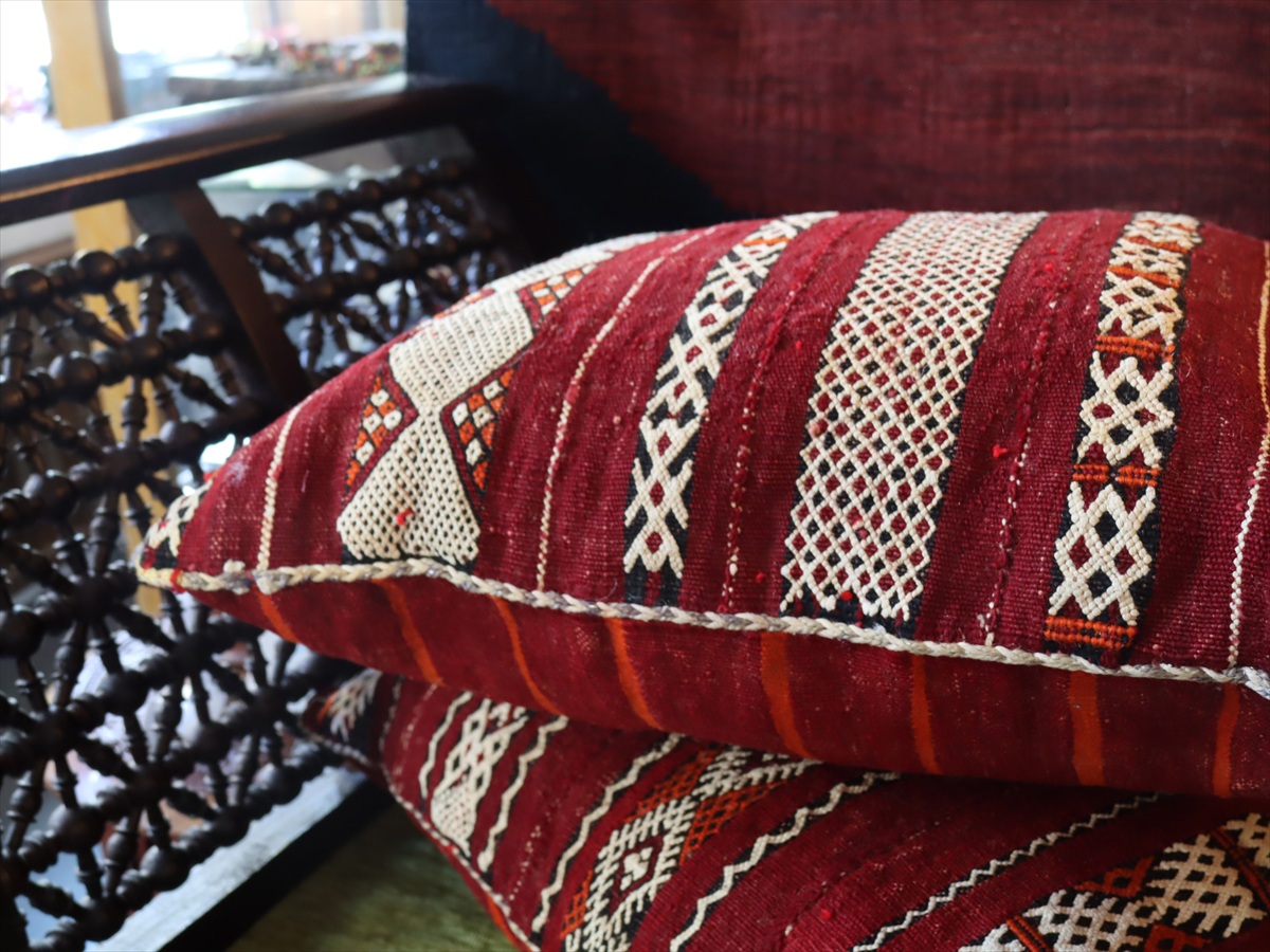 ゼンモール族の伝統的な色使いで織られた赤と黒のキリムが使われ、クラシックなモロカンスタイルにぴったりのクッション。裏面はカジュアルなストライプで、また違った雰囲気が楽しめます。
