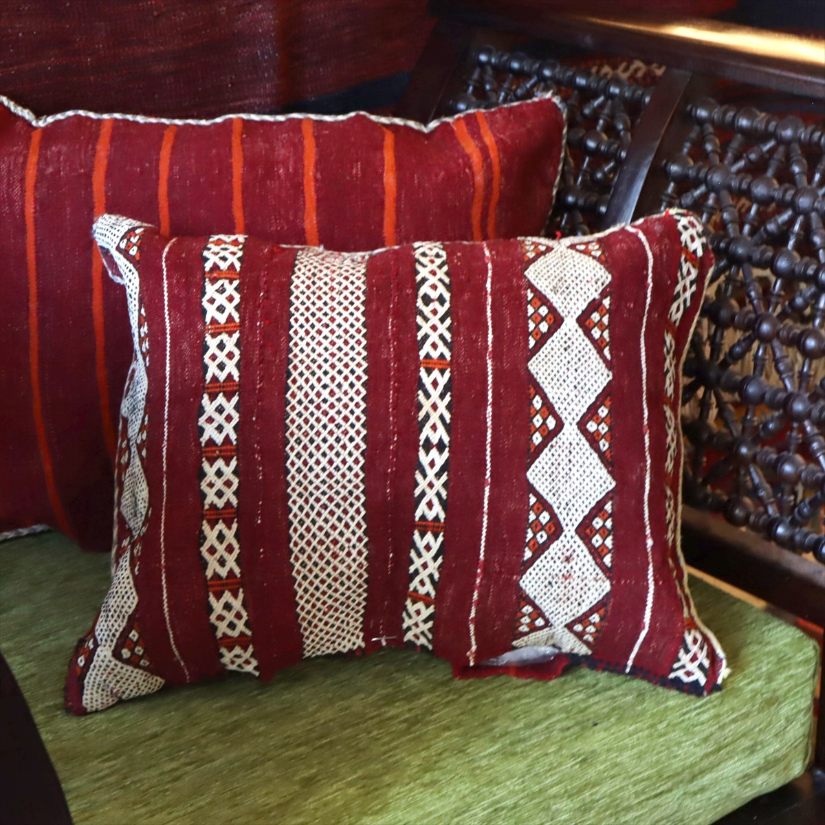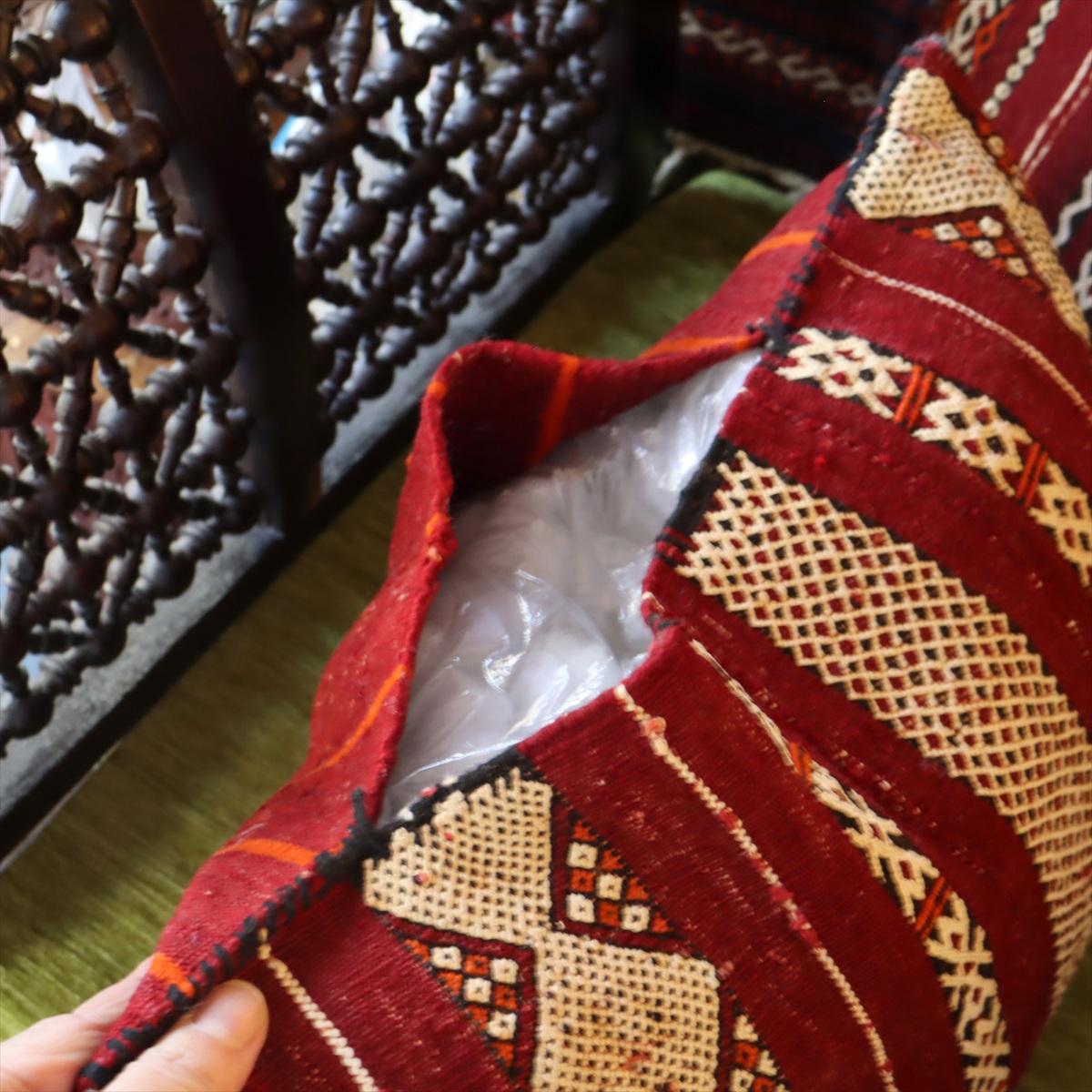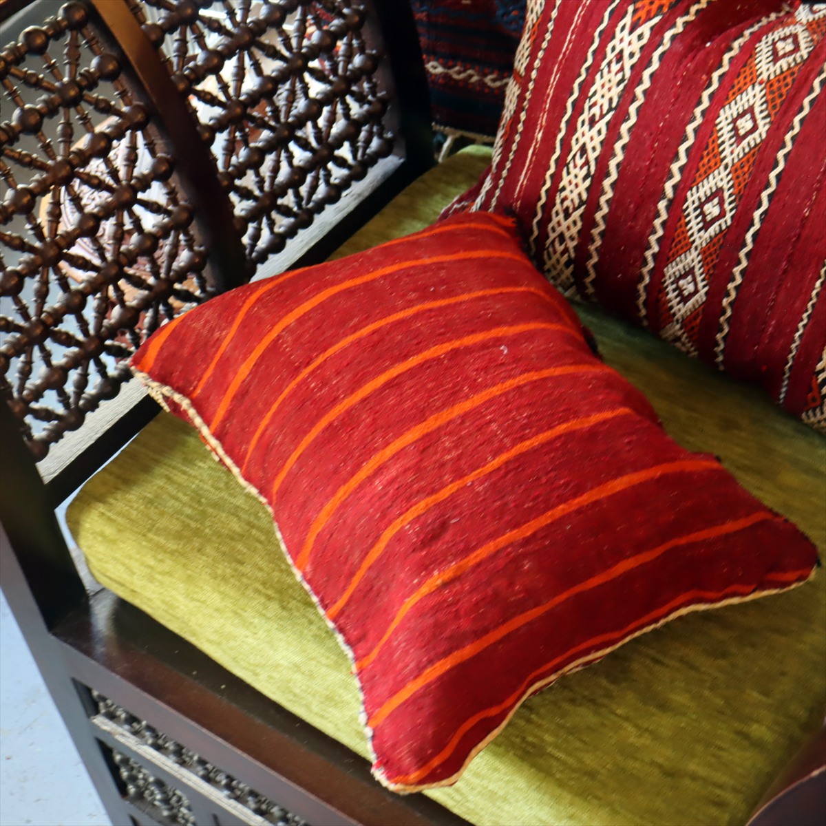 ゼンモール族の伝統的な色使いで織られた赤と黒のキリムが使われ、クラシックなモロカンスタイルにぴったりのクッション。裏面はカジュアルなストライプで、また違った雰囲気が楽しめます。