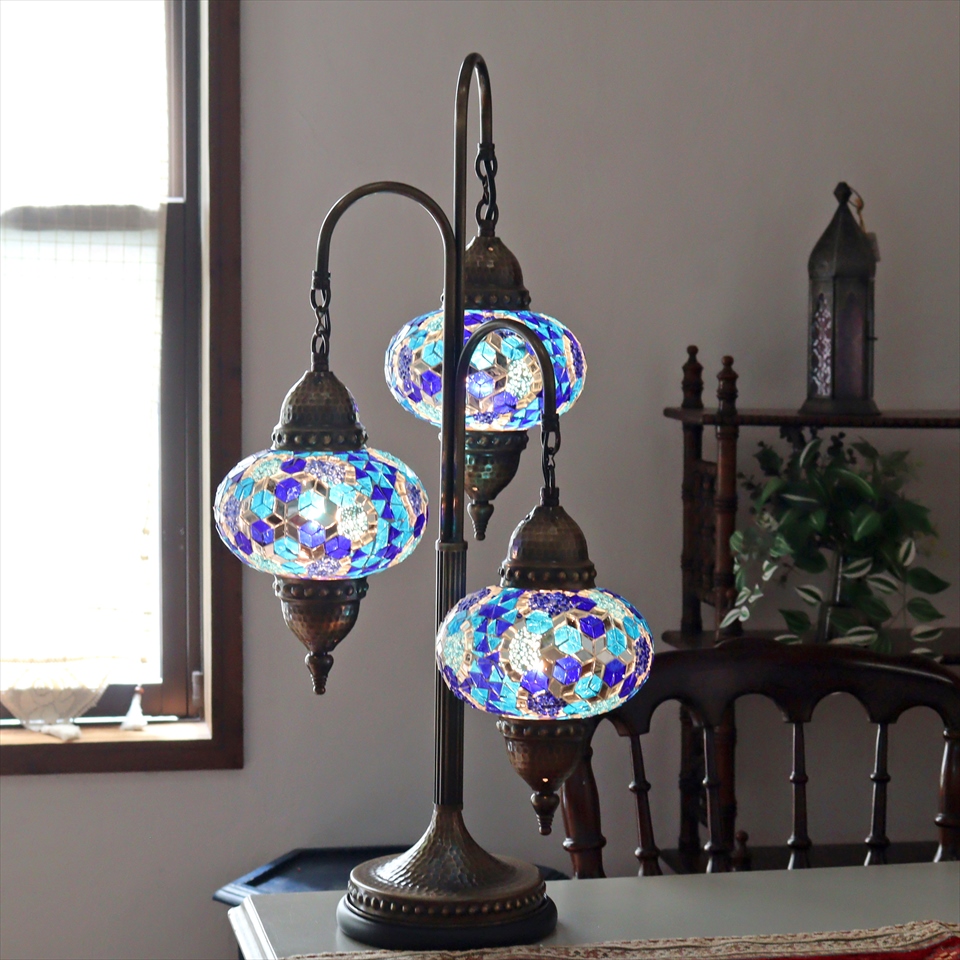 6. 【10%OFF】トルコランプ モザイクランプ テーブルシャンデリア 3灯 全高69cm 直径36cm ブルー