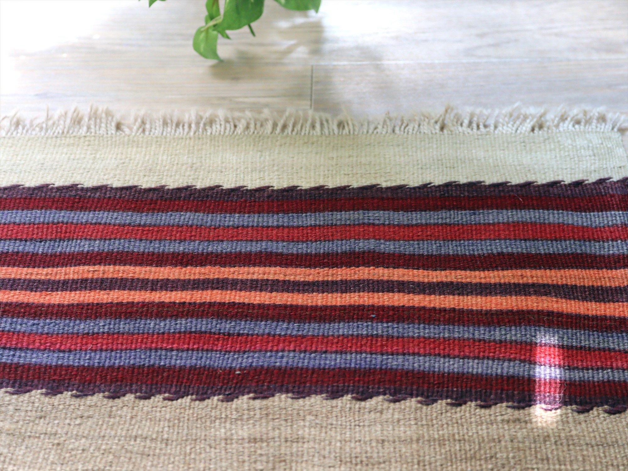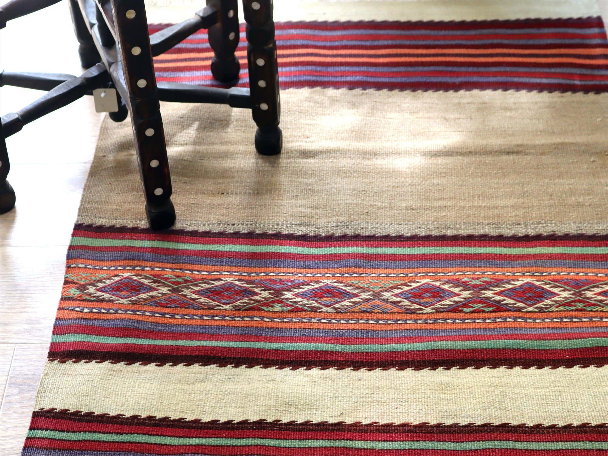 染められていないナチュラルな羊毛と、レッド、オレンジなど暖色系の色を使って織られた、シンプルなボーダーデザインのキリム。穀物などを入れる袋として使うために織られたキリムで、このピースは、袋の表面として織られたものです。