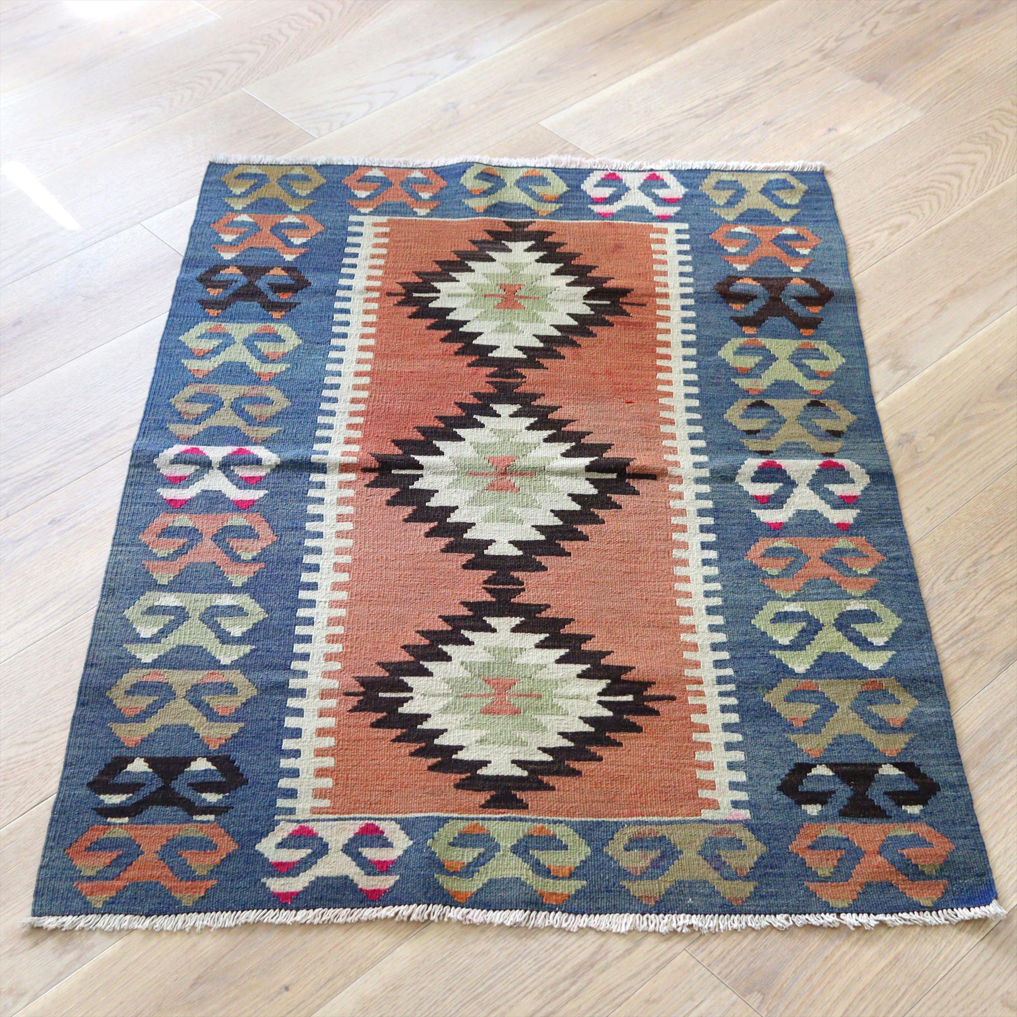 レッドとネイビーをベースとしたフィールドに、魔除けを意味するイーブルアイと、勇猛さの象徴である雄羊の角(コチボユヌズ)が織られたデザイン。もともとは鮮やかな色だったと考えられますが、日焼けしてだいぶ落ち着いた色となっています。