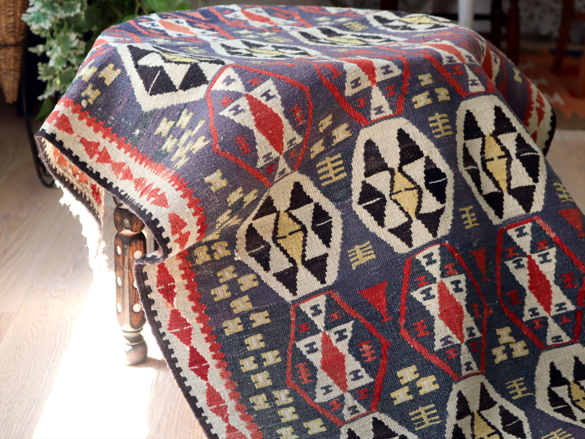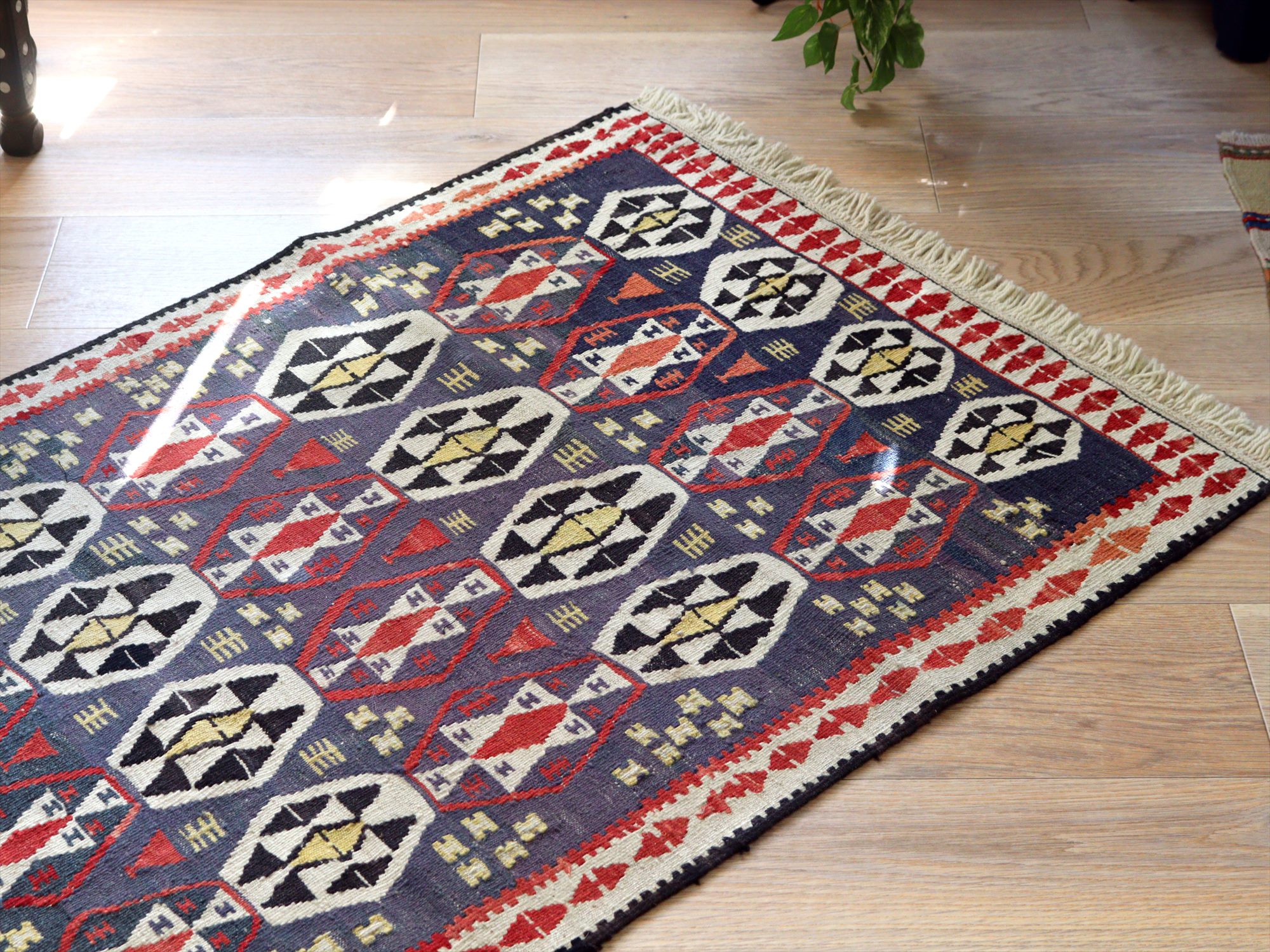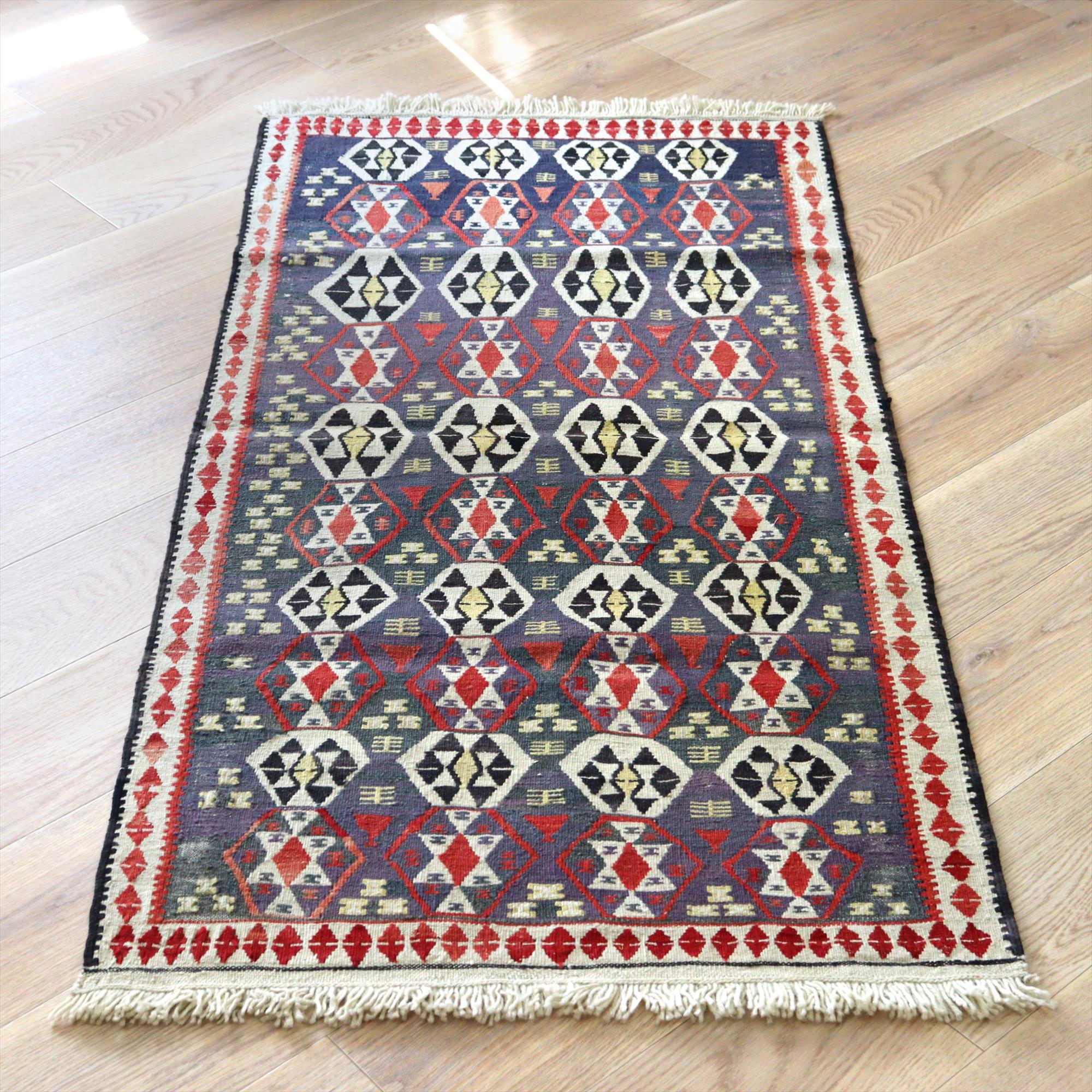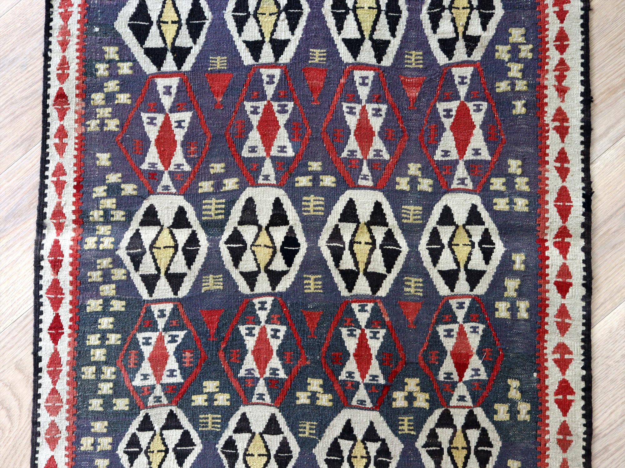 トルコ南東部、イランとの国境に近いエリアで織られたワン地方のキリム。グラデーションのあるムラサキベースに、幾何学模様が連なるように織られたデザイン。全体的にだいぶ色褪せているのがわかります。