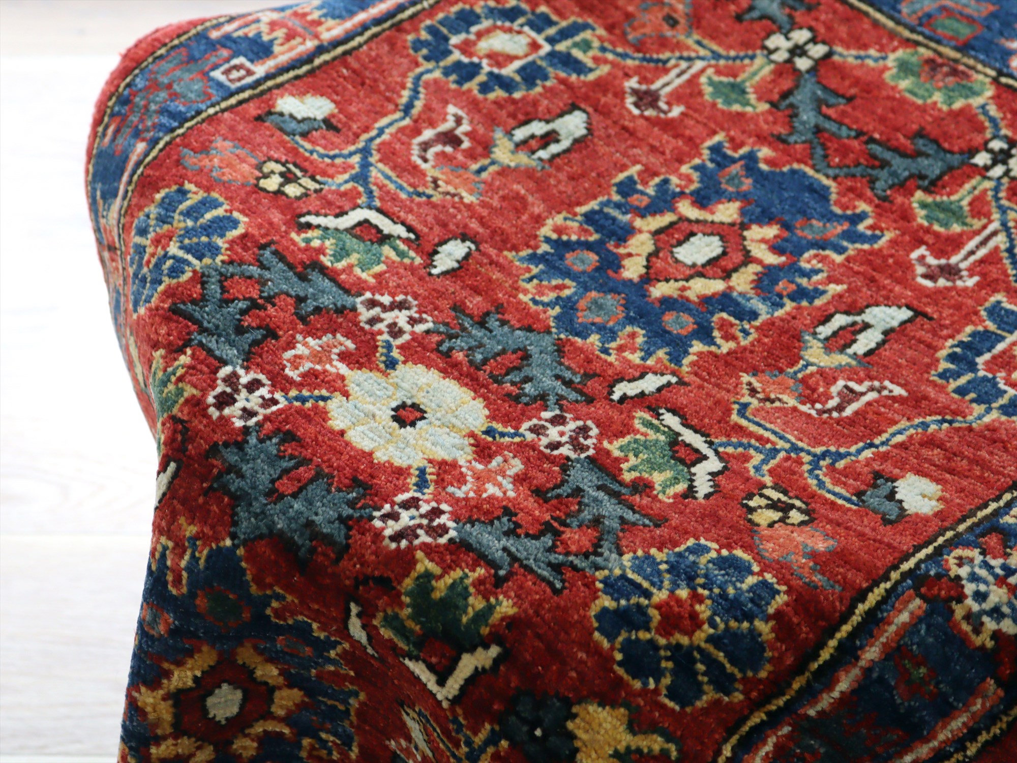 発色の良いレッドのグラデーションに、華やかに咲く花が優雅に表現されたクラシカルな1枚。額縁部分にもブルーベースに小花が連なるように織られ、まとまりのあるデザインに。こちらの絨毯は、天然染料により染色された手紡ぎの糸を使い、織られたものとされています。
