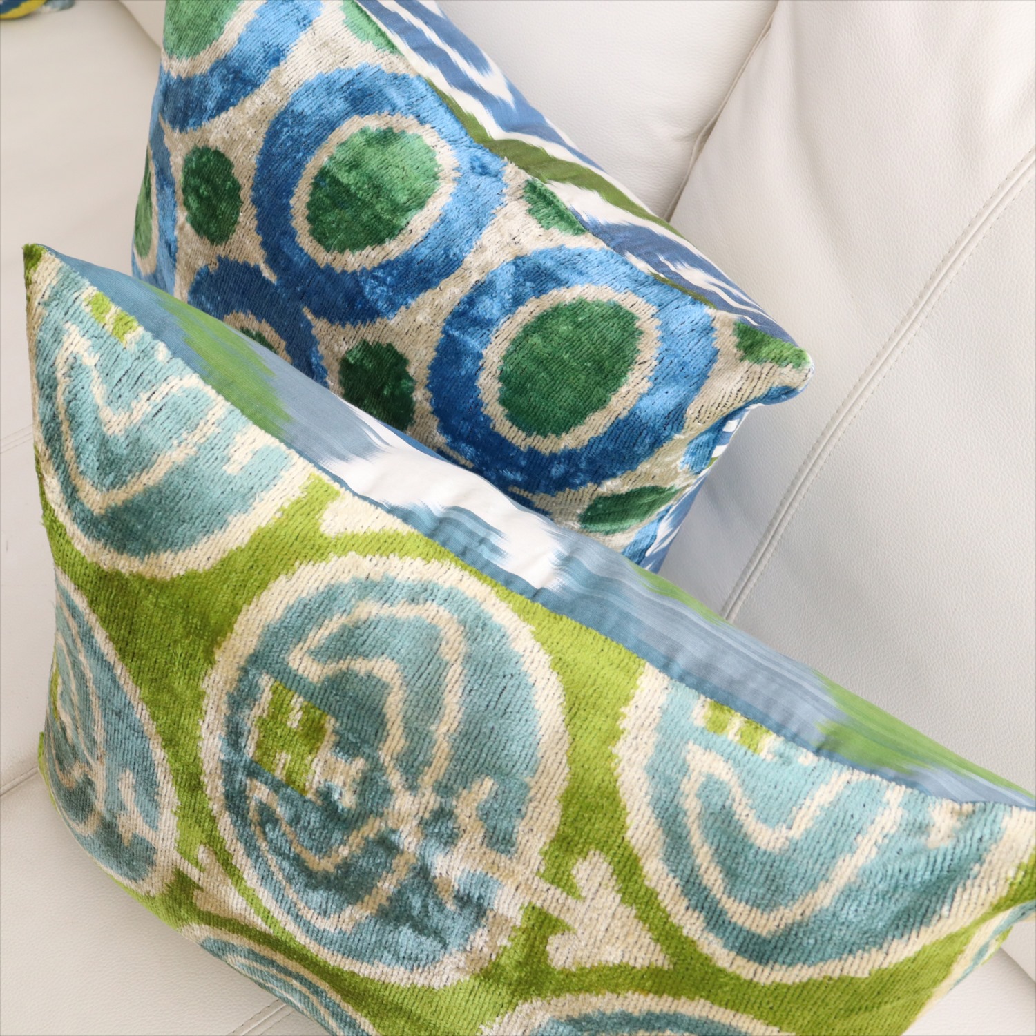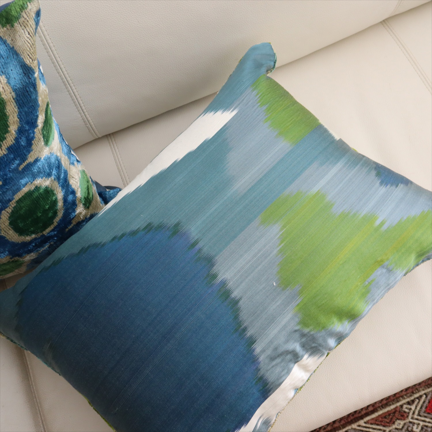 ウズベキスタンで「アトラス」と呼ばれる、中央アジアの女性たちの衣装用に織られた、手機織りの絣布(かすり・イカット)を使ったクッションカバー。