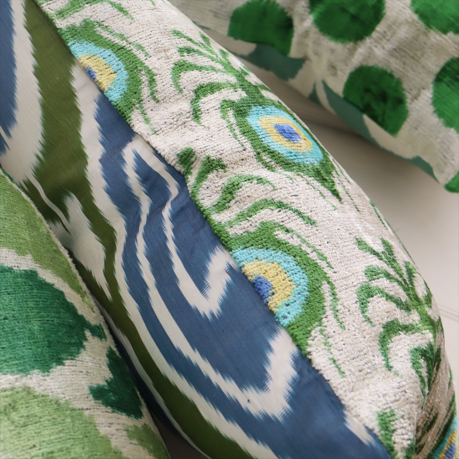 - アトラス ベルベットイカットクッションカバー 両面シルク クジャクの羽 アイボリーxグリーン Silk Velvet Cushion - Double-Sided Design
