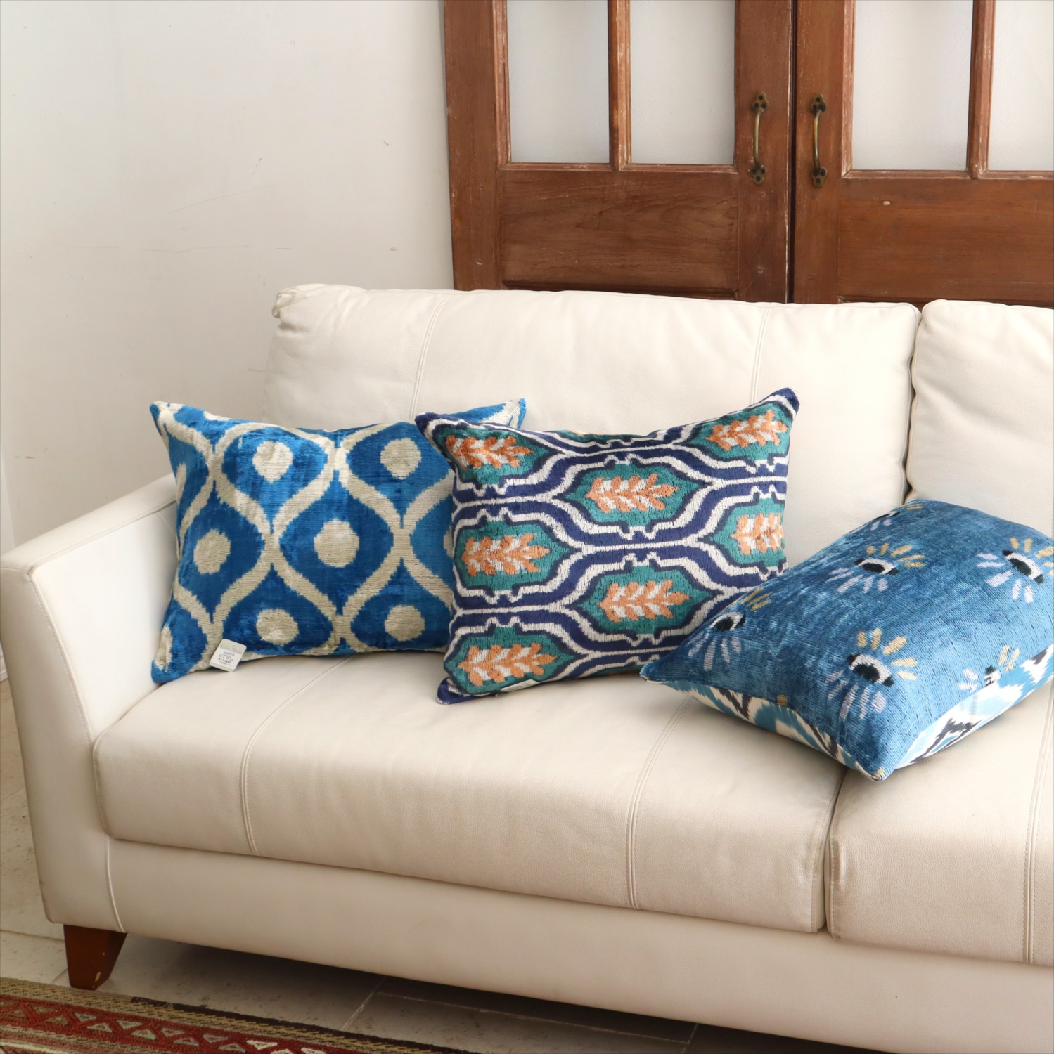 アトラス ベルベットイカットクッションカバー 両面シルク ブルー ランタン柄 Silk Velvet Cushion - Double-Sided Design