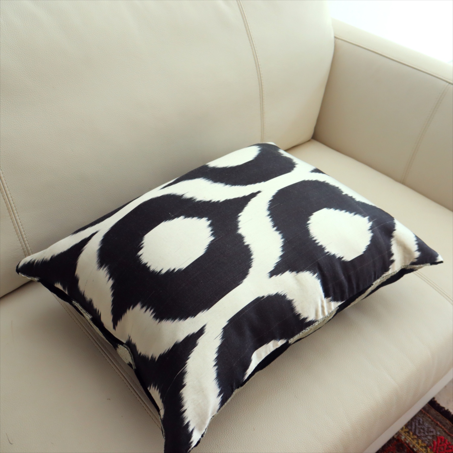ウズベキスタンで「アトラス」と呼ばれる、中央アジアの女性たちの衣装用に織られた、手機織りの絣布(かすり・イカット)を使ったクッションカバー。