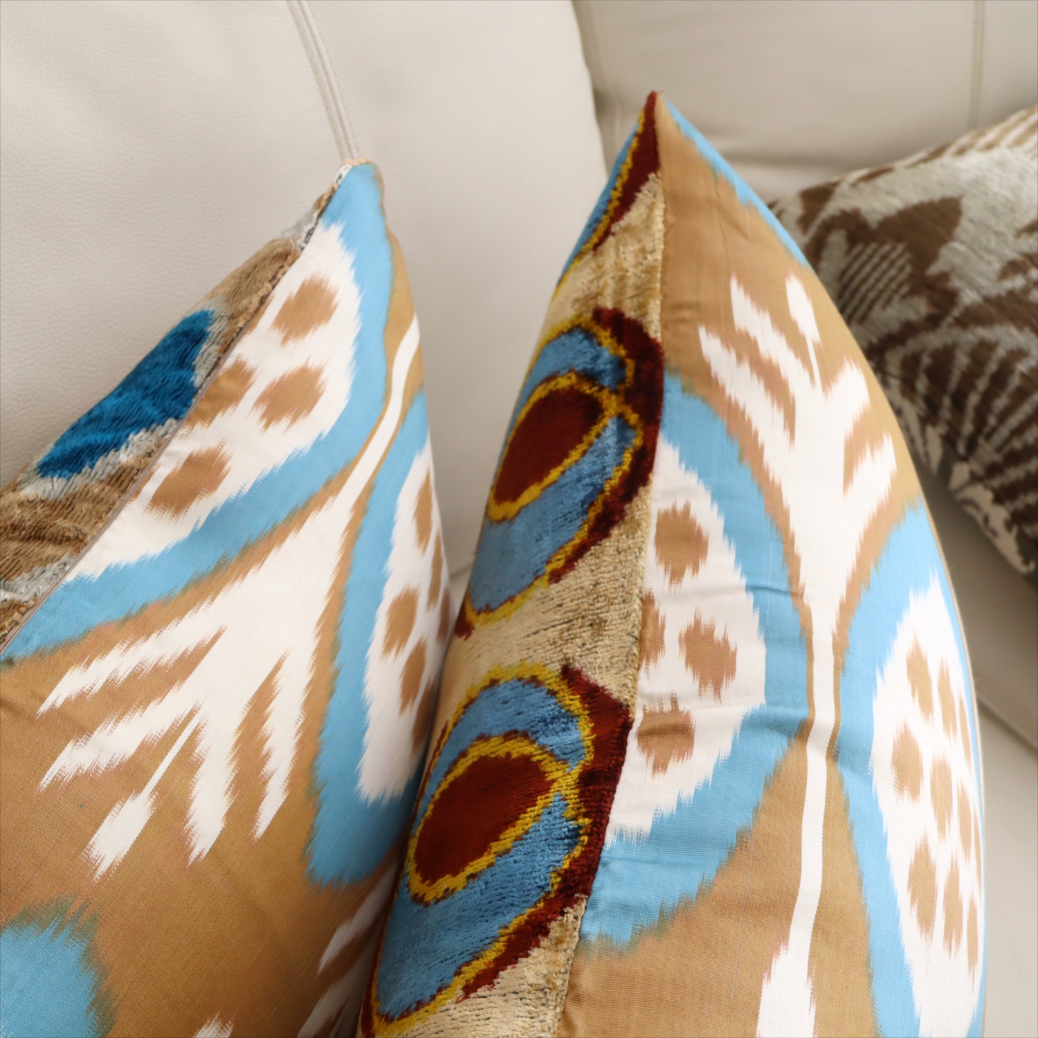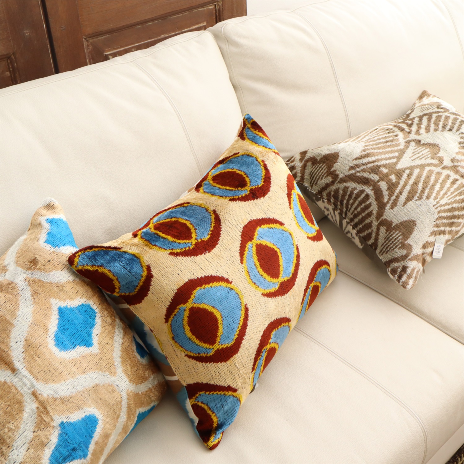 - アトラス ベルベットイカットクッションカバー 両面シルク 抽象柄 ターコイズxブラウン Silk Velvet Cushion - Double-Sided Design