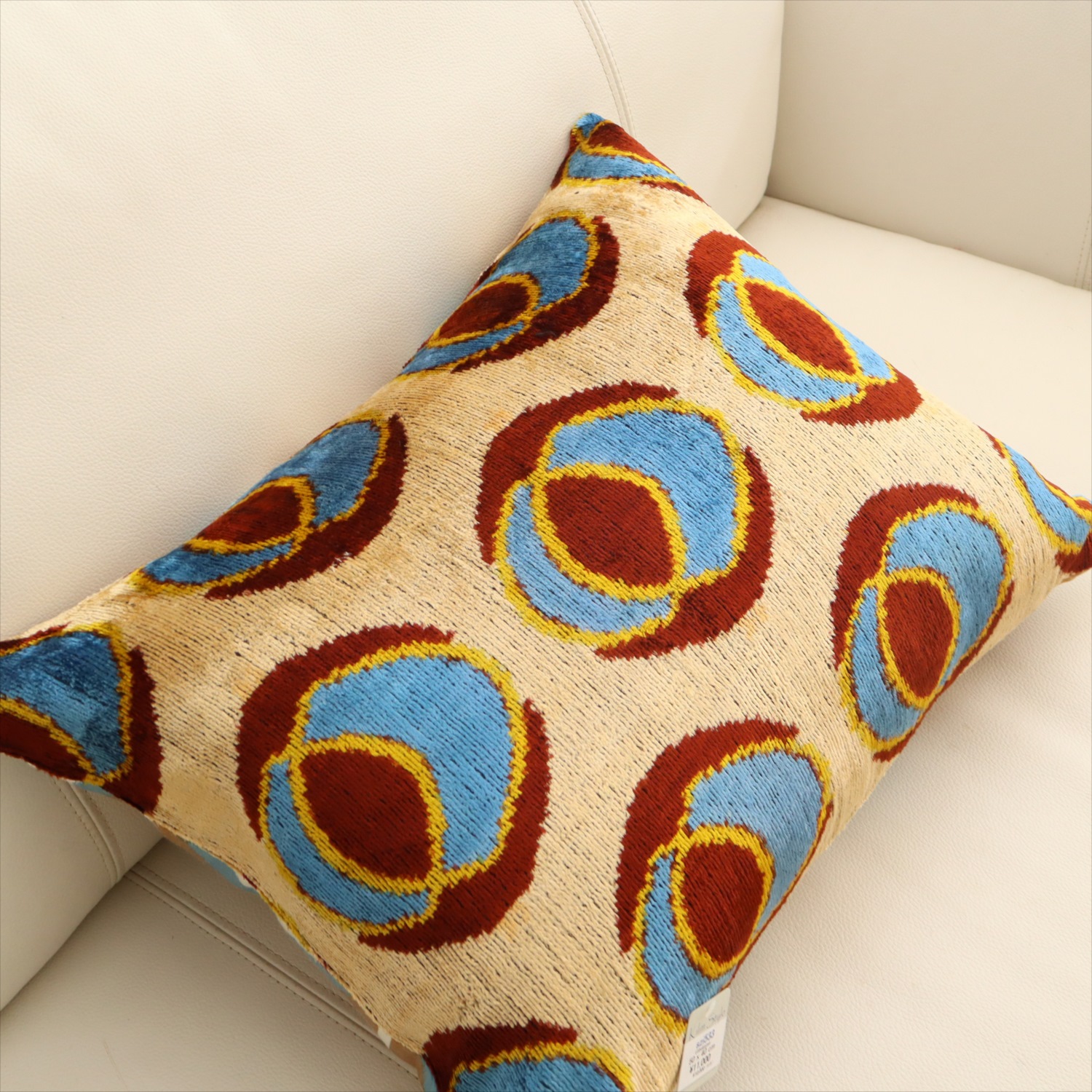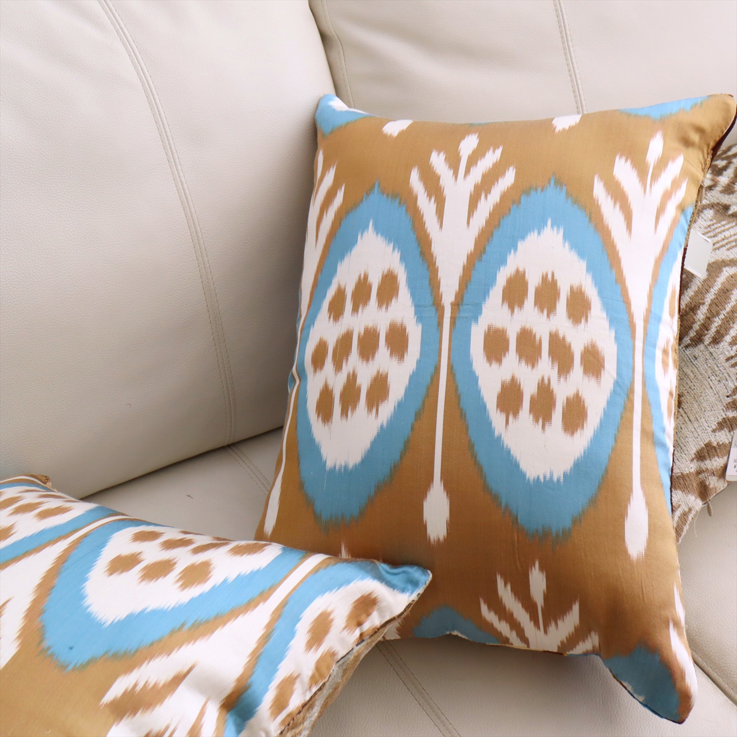 アトラス ベルベットイカットクッションカバー 両面シルク 抽象柄 ターコイズxブラウン Silk Velvet Cushion - Double-Sided Design