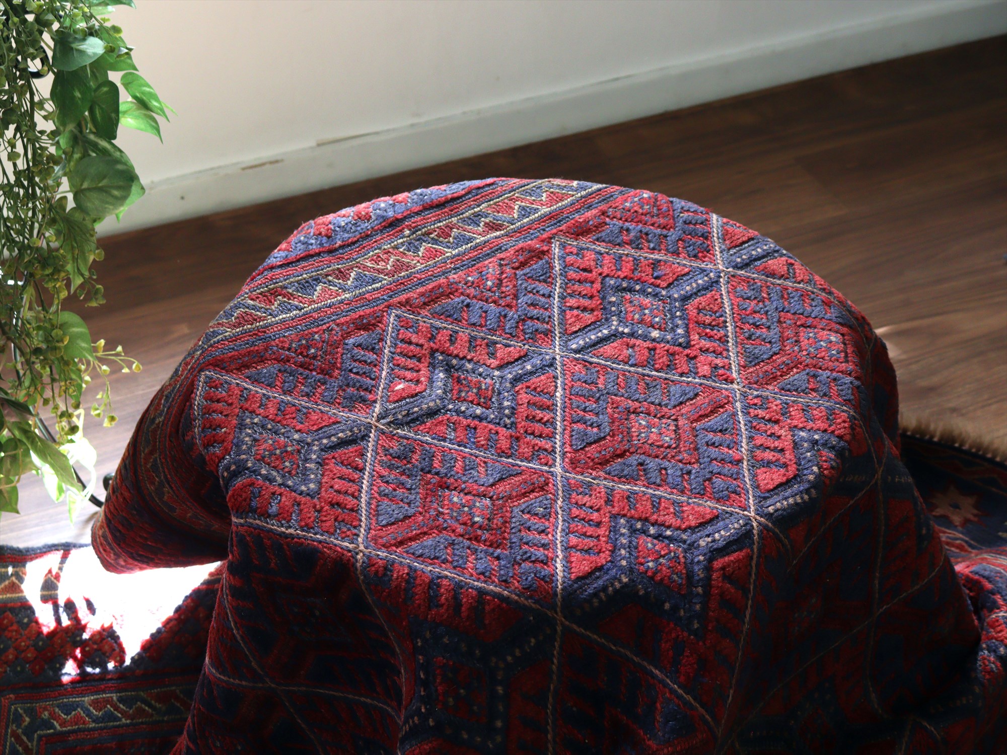 アフガニスタン東部、イランと国境を接するエリアの緻密な織りのキリムです。細かい織り目のスマック織りをベースに、立体感のあるカーペット織りでモチーフをレリーフのように織り込んだ1枚。