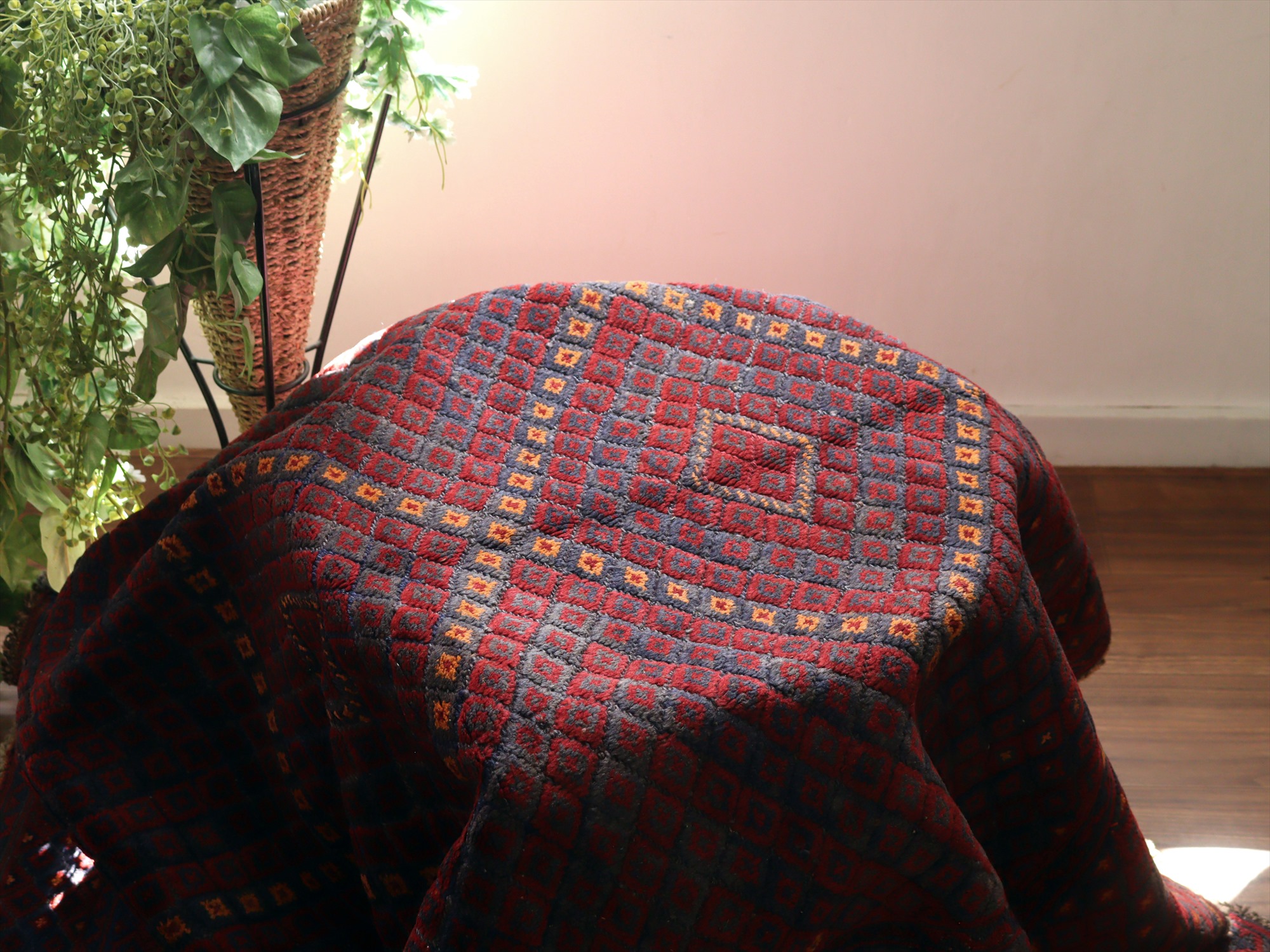 ベース地はスマック織りでしっかりとした織り地です。モチーフ部分はパイル(毛足)のある織りで、表面には立体感があります。