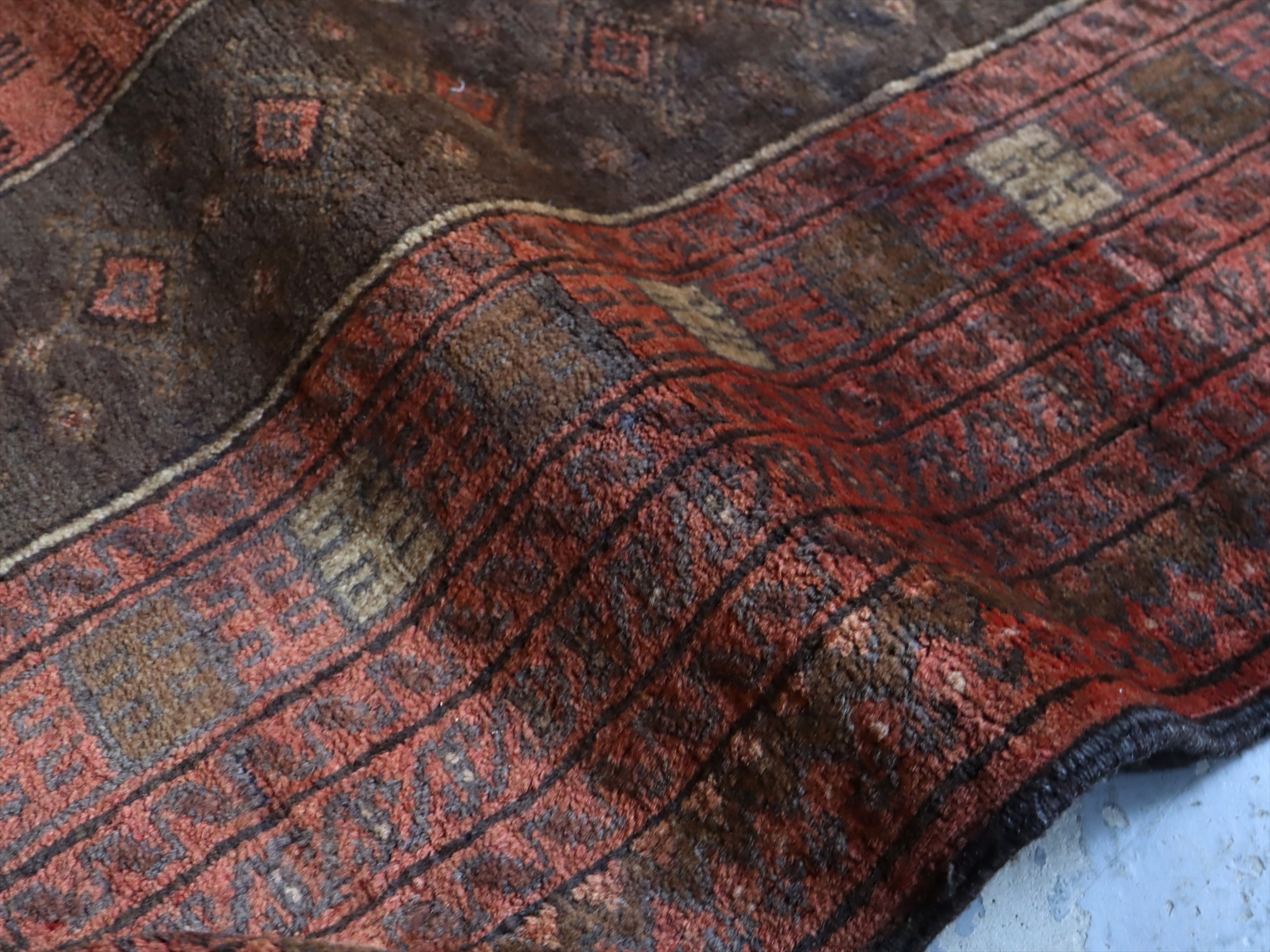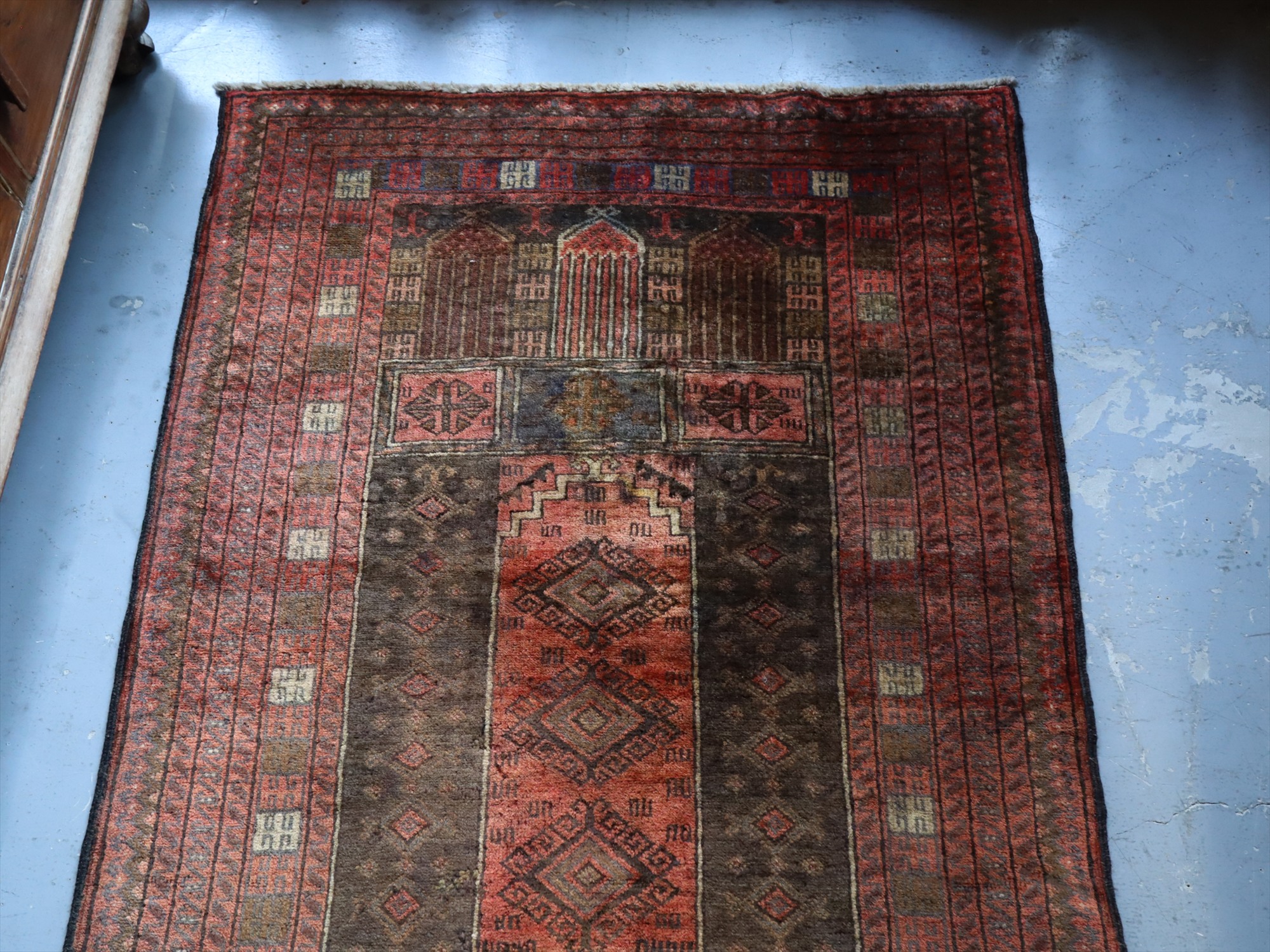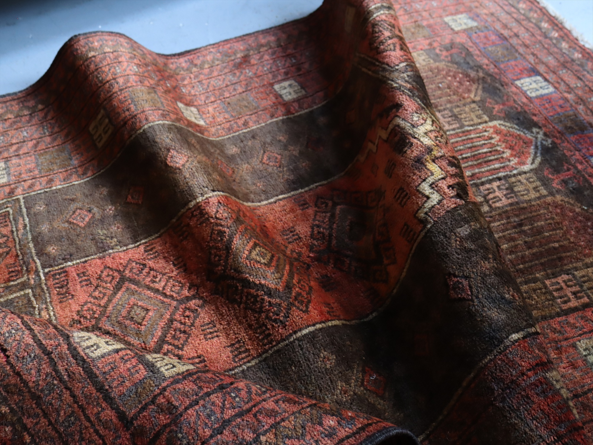 朱色に近いレッドとブラウンを基調とした色使いで、お祈りのくぼみを示すミフラープと幾何学模様が織られています。くすんだ色合いになっていて、こなれた感が良く出ています。