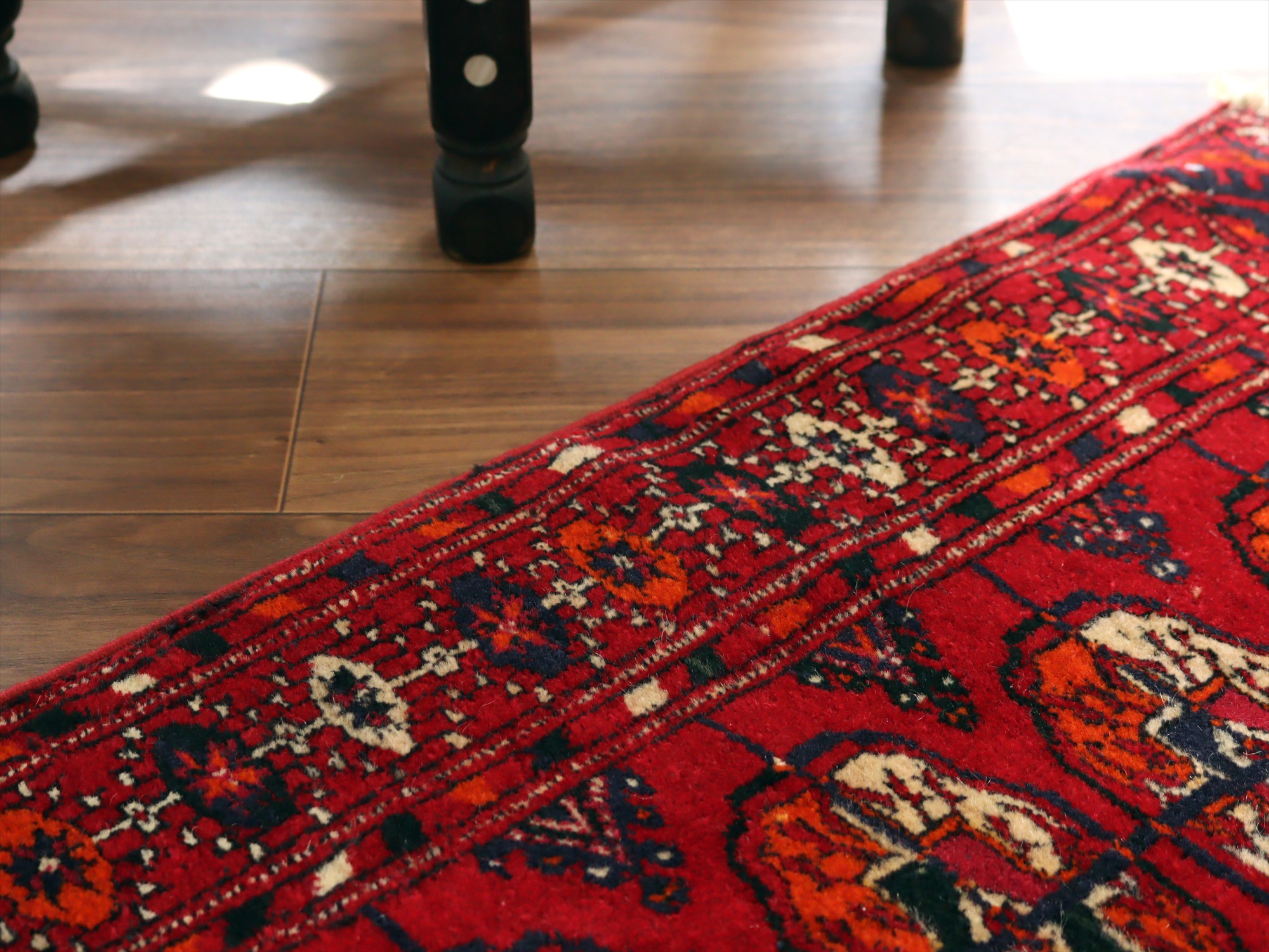 イラン東部からアフガン、パキスタンなどに住むバルーチ族のカーペット。赤地にギュルのモチーフが入ったバルーチの典型的なデザインです。