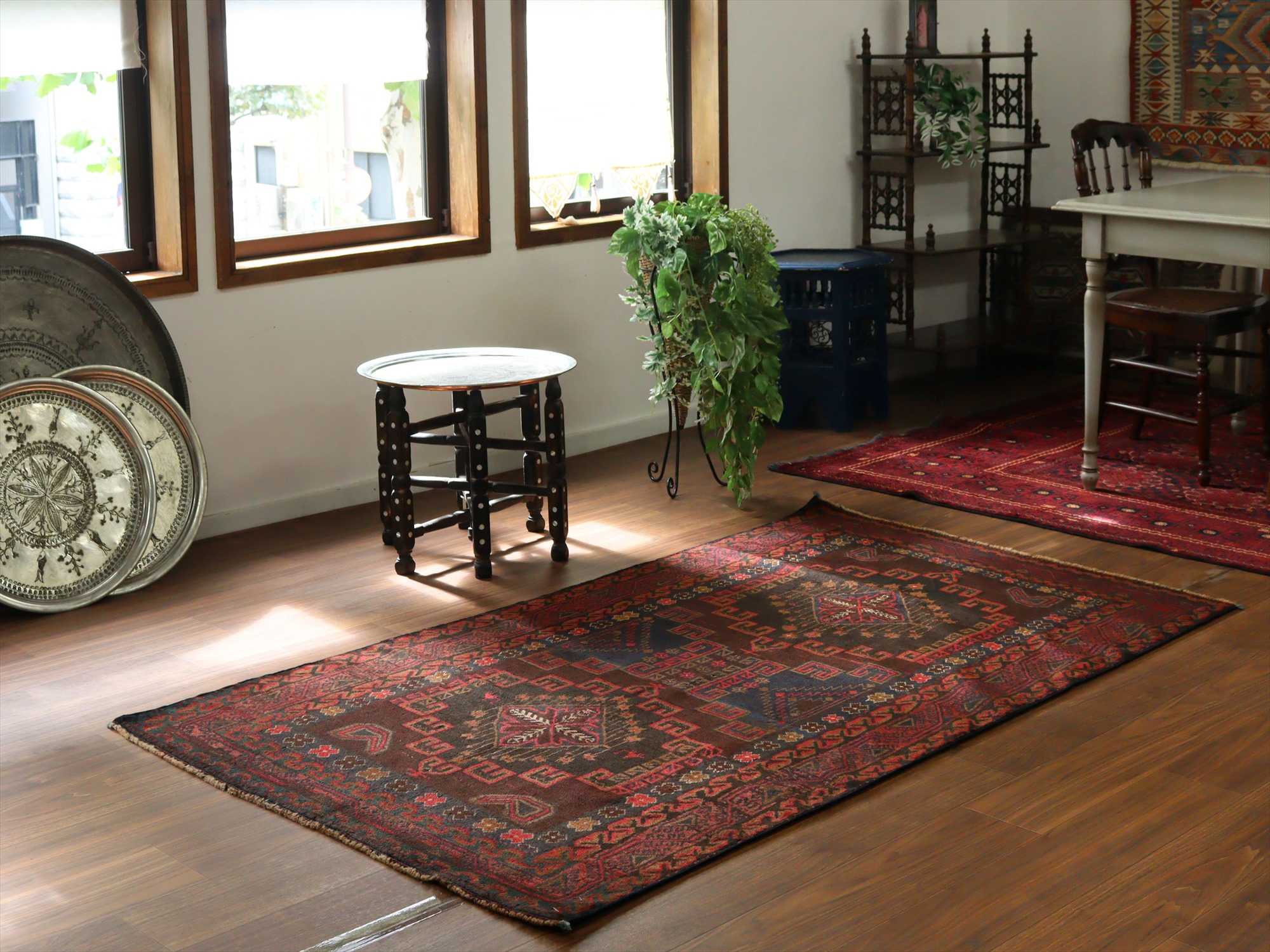 ブラウン、レッド、ネイビーの色使いで織られた絨毯。落ち着いた色合いながらも、小花やメダリオン、それにボーダー(額縁)部分を構成する色は明るく全体のバランスがとれた1枚です。