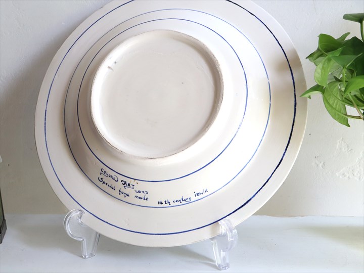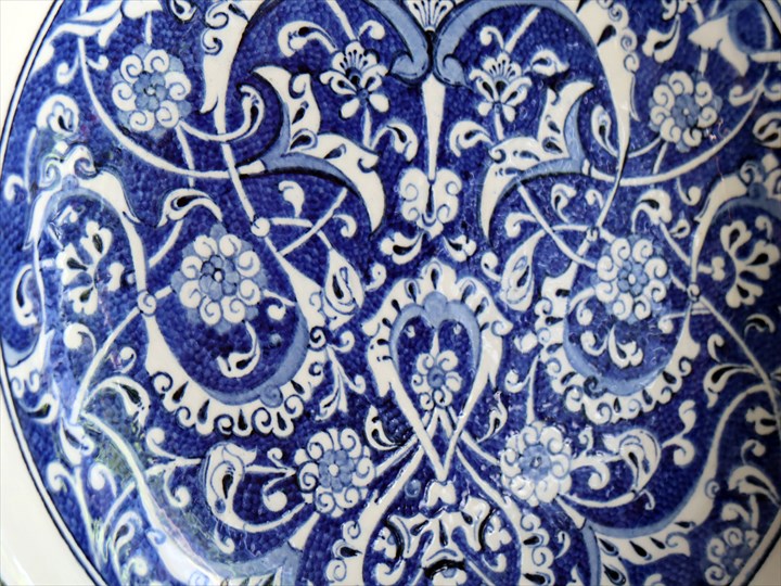 オスマントルコ宮廷へ献上するために、イズニックで陶器製作が始まった16世紀初頭に作られた絵皿を再現しています。青の濃淡を使って、緻密な筆遣いで描かれたデザインは、明代中国の影響を強くうけつつも、無限の広がりを表現するイスラミックモチーフに変化しています。