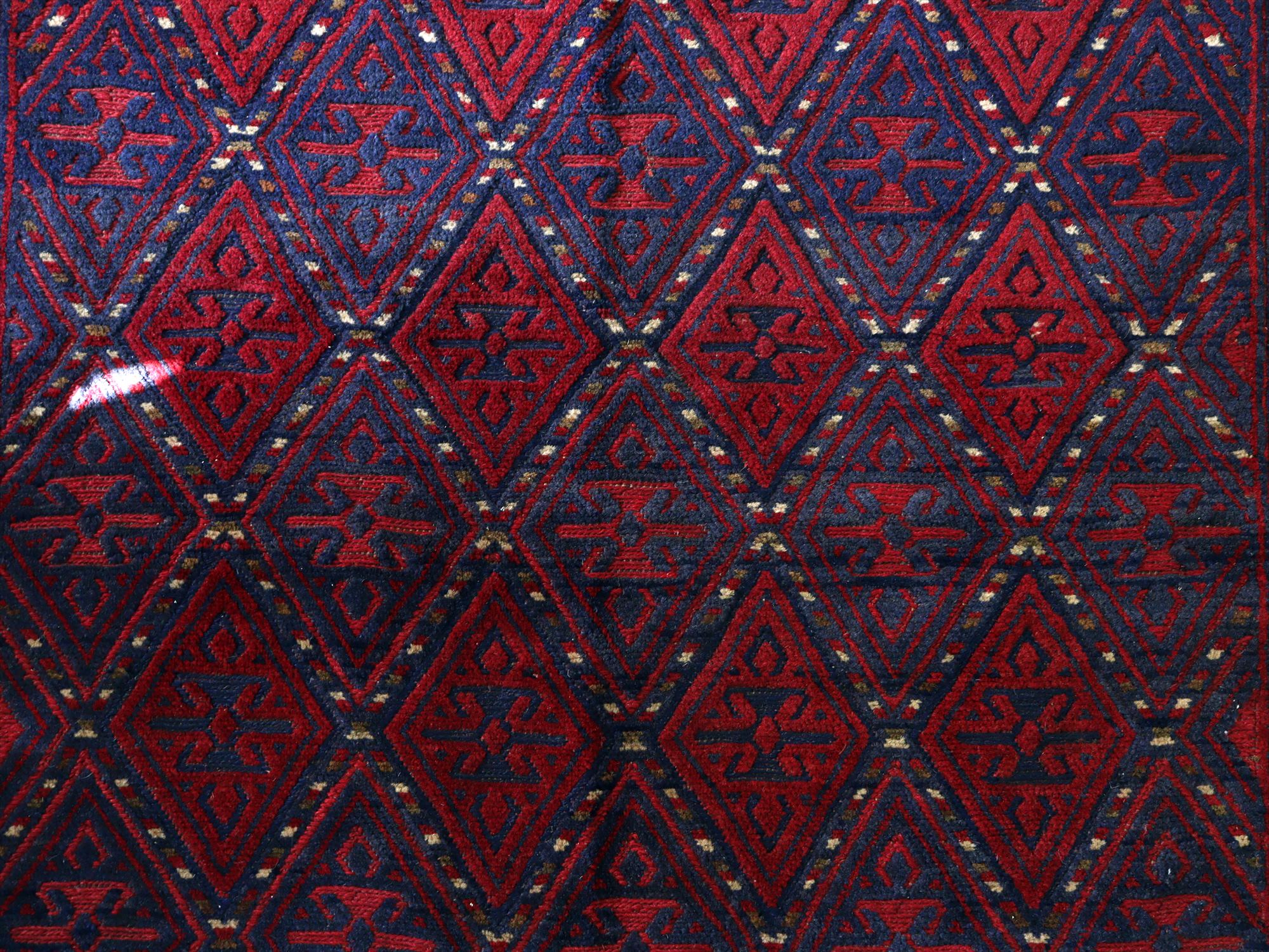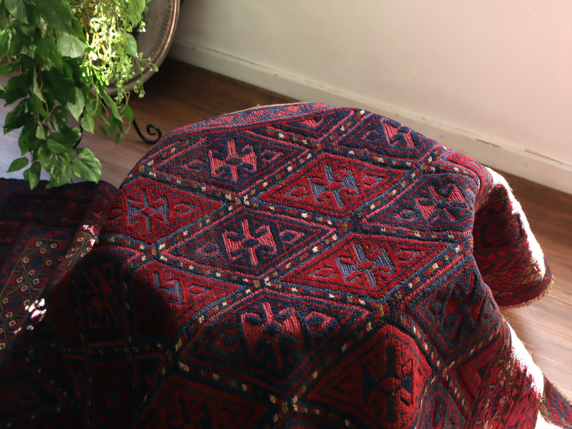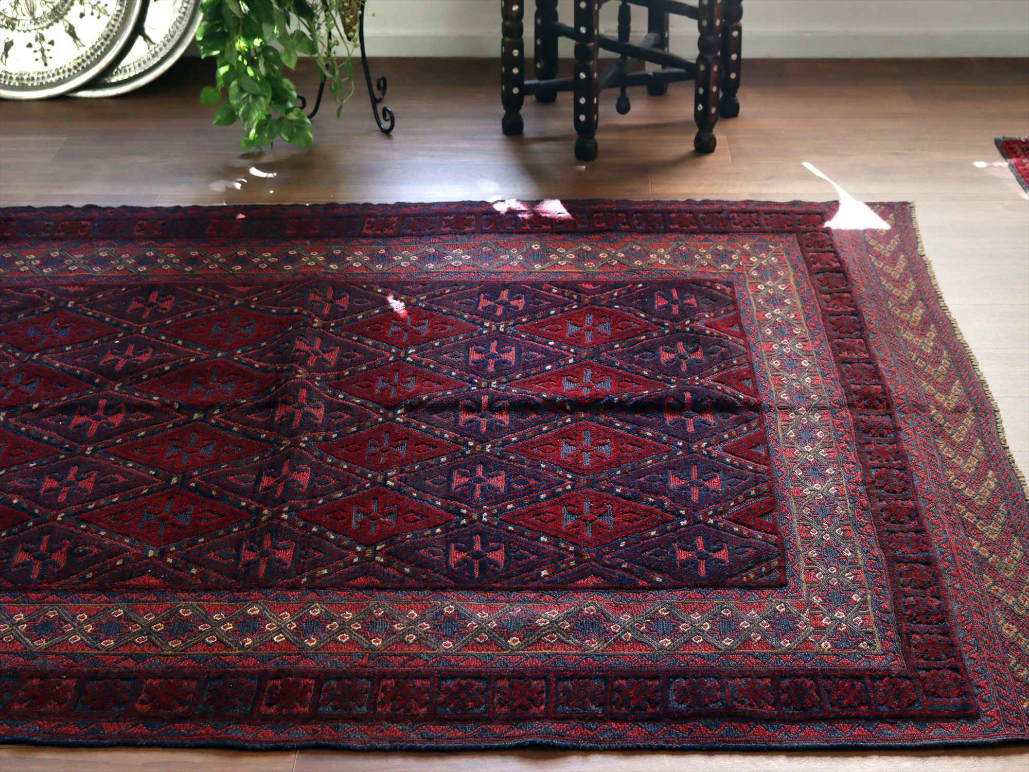 アフガニスタン東部、イランと国境を接するエリアの緻密な織りのキリムです。細かい織り目のスマック織りをベースに、立体感のあるカーペット織りでモチーフをレリーフのように織り込んだ1枚。