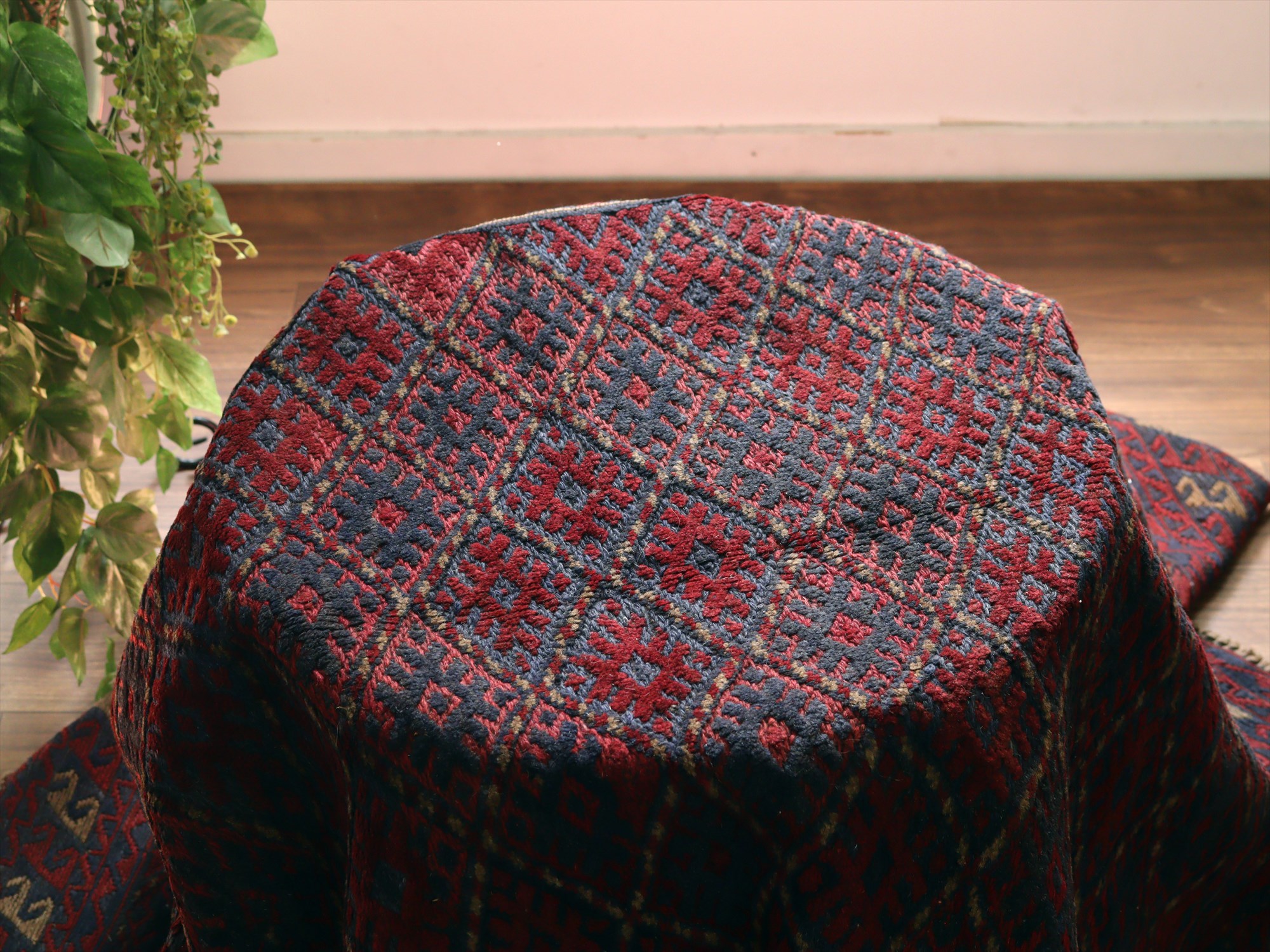 ベース地はスマック織りでしっかりとした織り地です。モチーフ部分はパイル(毛足)のある織りで、表面には立体感があります。