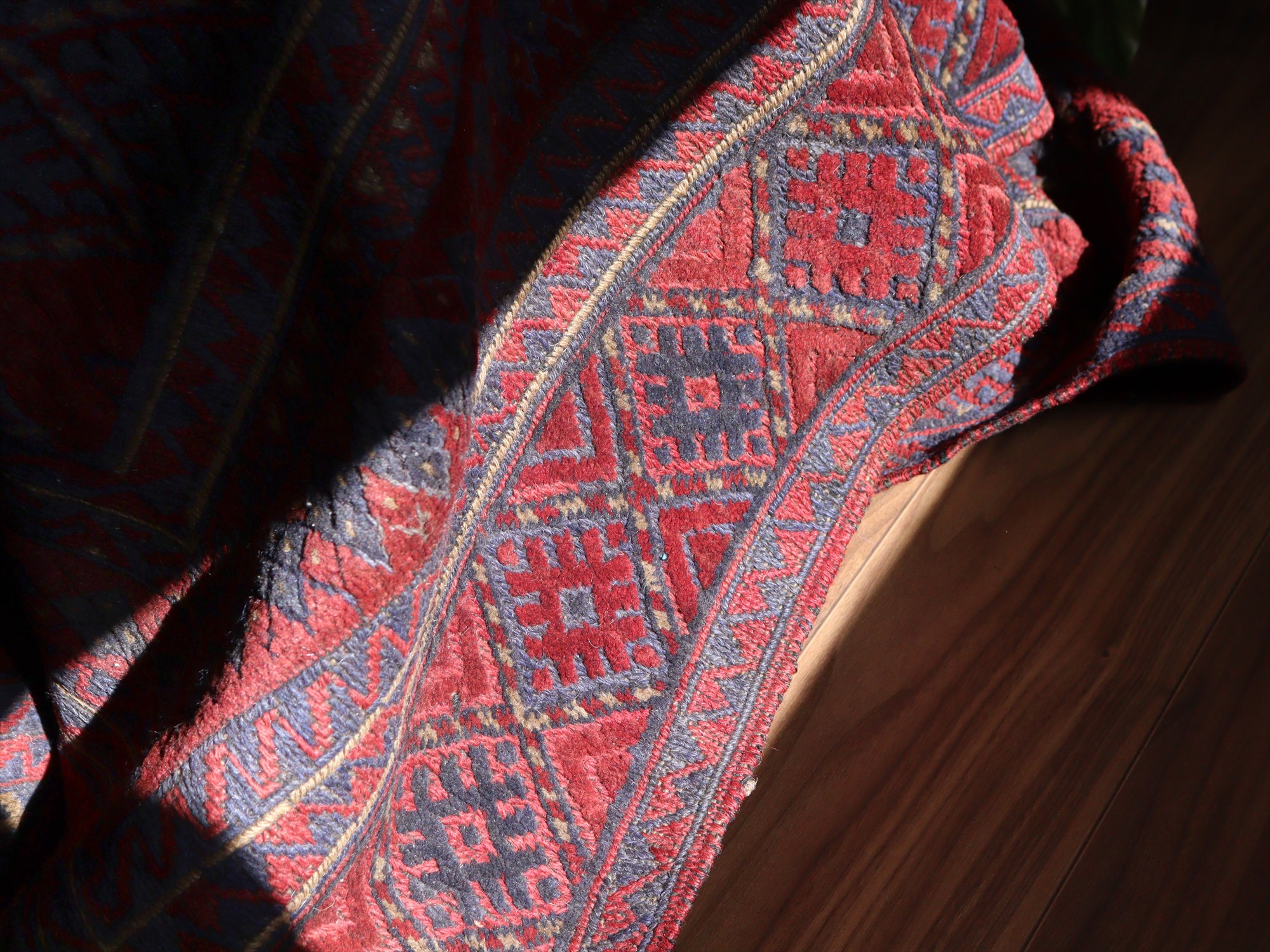 アフガニスタン東部、イランと国境を接するエリアの緻密な織りのキリムです。細かい織り目のスマック織りをベースに、立体感のあるカーペット織りでモチーフをレリーフのように織り込んだ1枚。