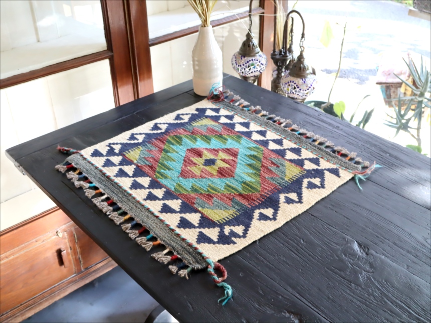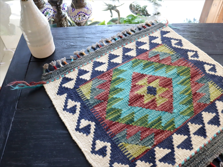 およそ50cm角のミニサイズの手織りキリムです。トルコ、イランの伝統的な幾何学モチーフを再現して、現在はアフガニスタンで織られています。ユニークなカラーコンビネーションには、織り手の自由なアイデアで織られるキリムらしさがでています。