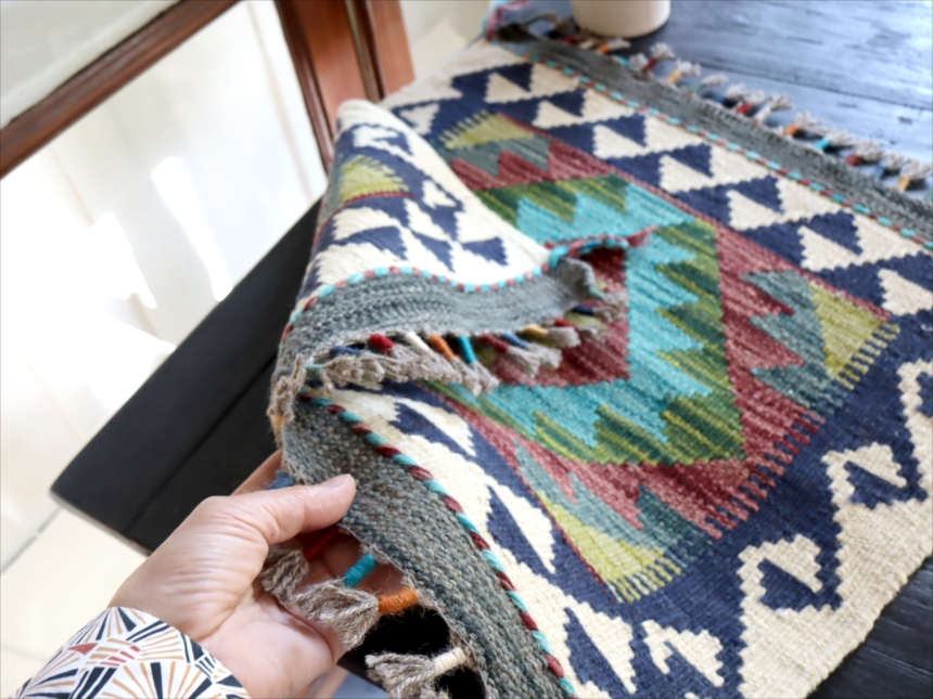 0.6-0.7mmほどの厚みのある平織りのキリムです。飾り糸がフリンジのようにのばしたままになっています。