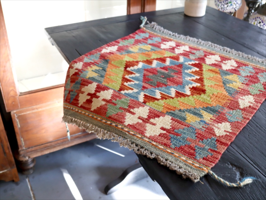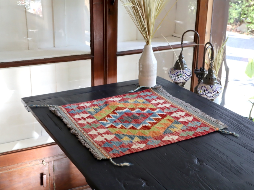 およそ50cm角のミニサイズの手織りキリムです。トルコ、イランの伝統的な幾何学モチーフを再現して、現在はアフガニスタンで織られています。ユニークなカラーコンビネーションには、織り手の自由なアイデアで織られるキリムらしさがでています。