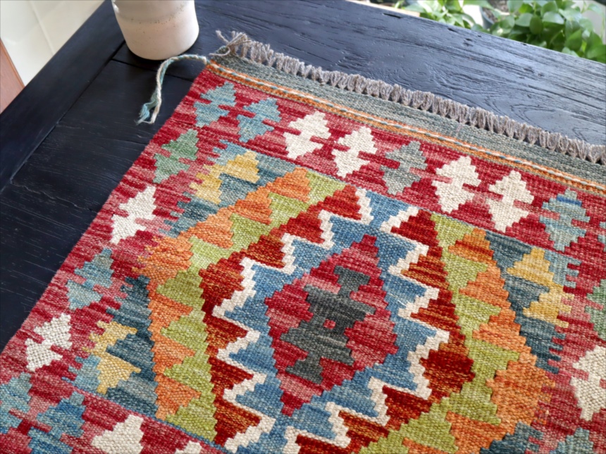0.6-0.7mmほどの厚みのある平織りのキリムです。飾り糸がフリンジのようにのばしたままになっています。