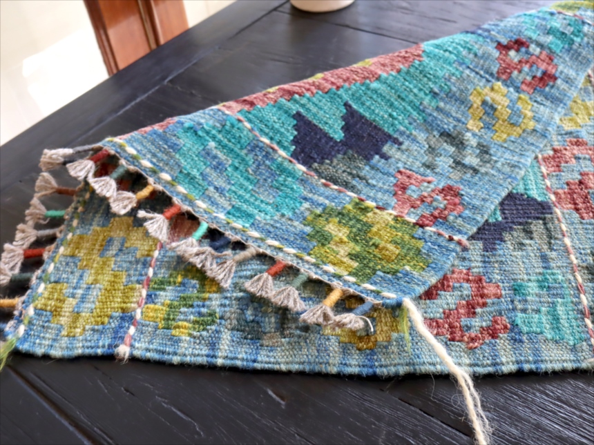 0.6-0.7mmほどの厚みのある平織りのキリムです。飾り糸がフリンジのようにのばしたままになっています。