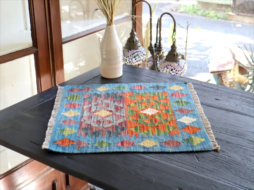 およそ50cm角のミニサイズの手織りキリムです。トルコ、イランの伝統的な幾何学モチーフを再現して、現在はアフガニスタンで織られています。ユニークなカラーコンビネーションには、織り手の自由なアイデアで織られるキリムらしさがでています。
